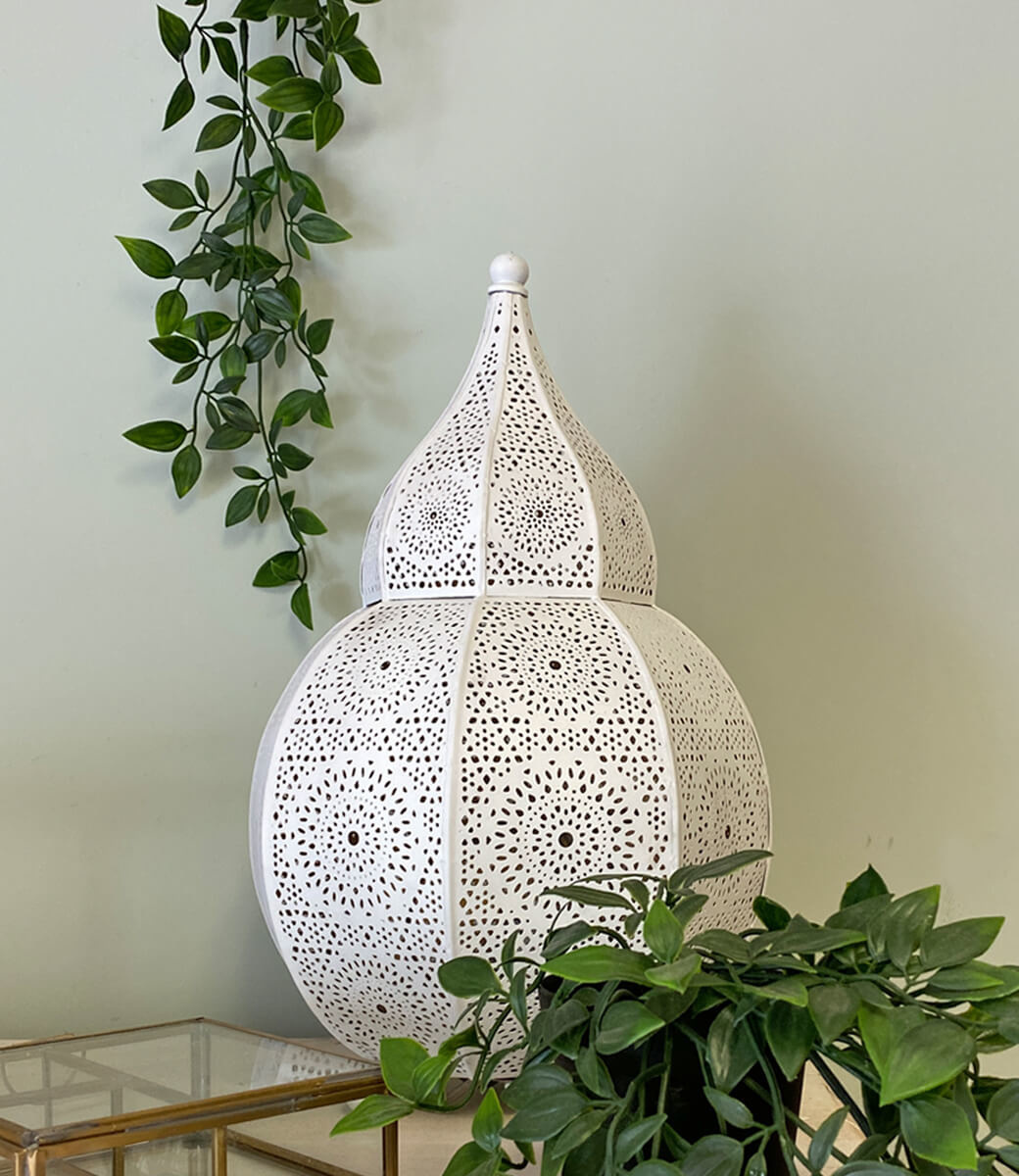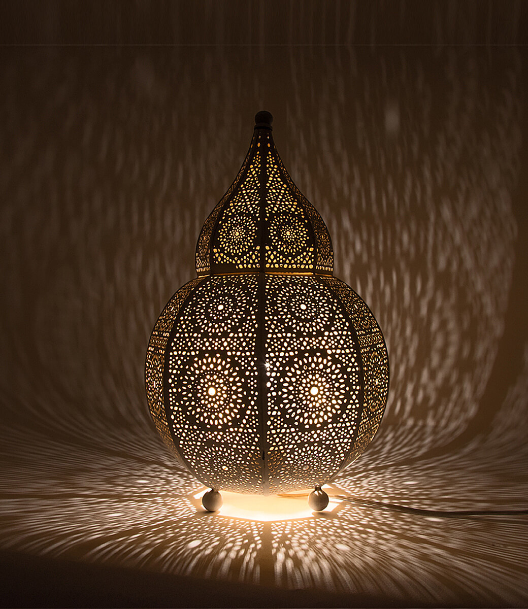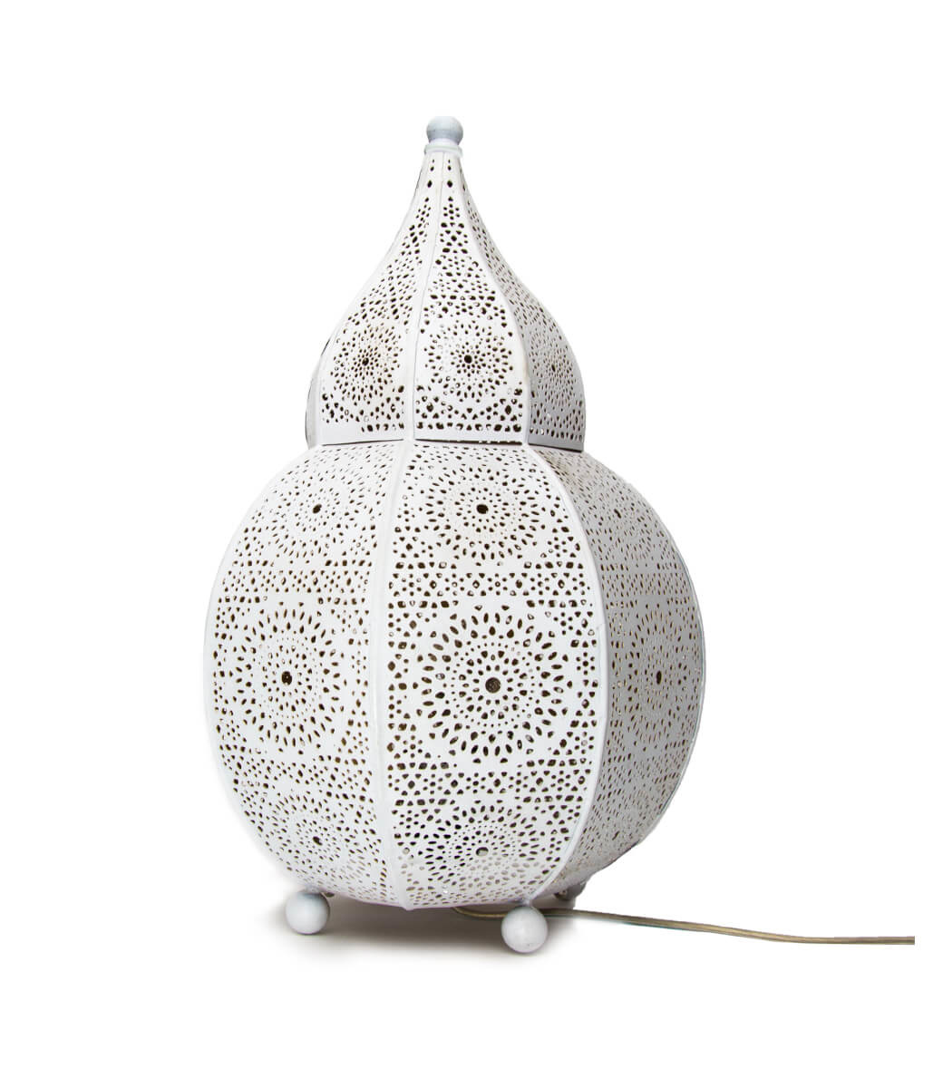 Weiße Tischlampe mit Blumen-Filigranmustern, weißer Farbe und goldener Innenseite im Stil von 1001 Nacht.Lesen Sie mehr
