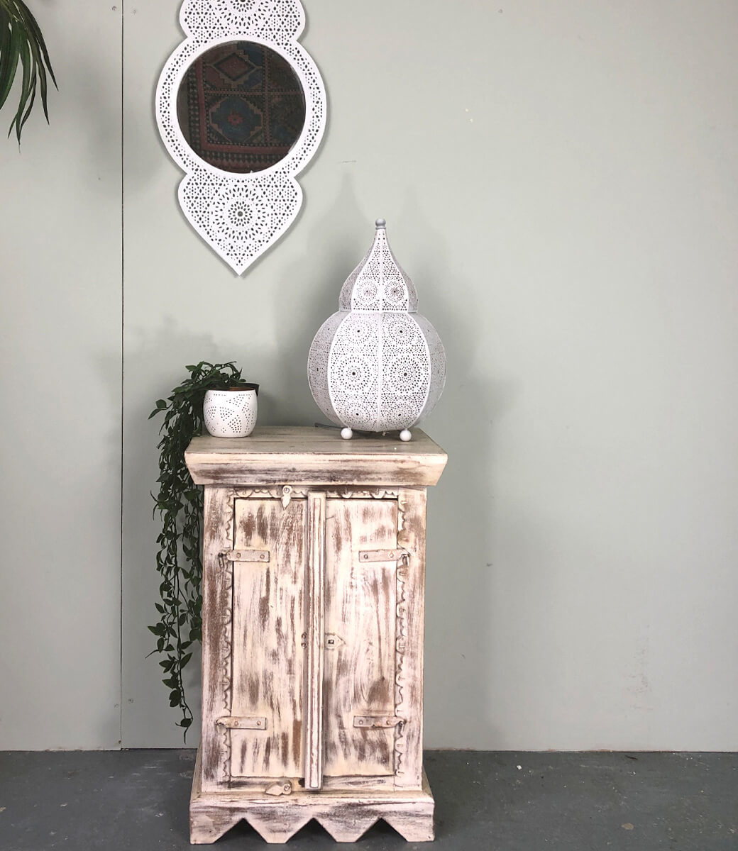 Weiße orientalische Tischlampe mit schönen Blumenmustern, die auch in der Hängelampenkollektion '1001 Nächte' zu finden sind. Jetzt sind auch diese Tischlampen in dieser romantischen Atmosphäre in Weiß und Schwarz erhältlich. Hergestellt aus Metall im orientalischen Stil und Form, hergestellt in Indien. Wenn die Lampe eingeschaltet ist, leuchtet sie warm, da die Innenseite goldfarben ist.