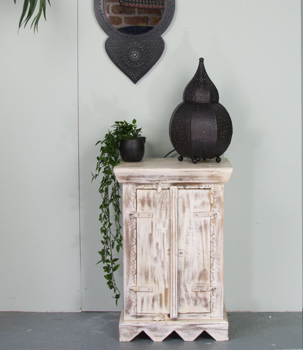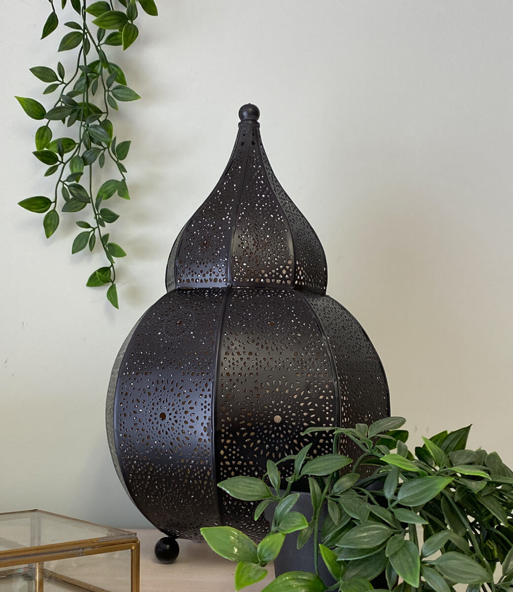 Orientalische schwarze Tischlampe im 1001-Nacht-Design mit Blumenmustern und einer goldenen Innenseite, die warm und stimmungsvoll an der Wand leuchtet. Die Tischlampe hat eine fröhliche Spitze oben und steht auf 4 runden Beinen, sodass auch auf der Oberfläche Licht scheint.