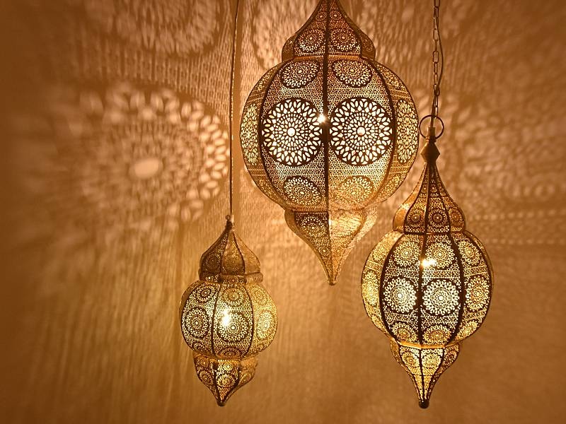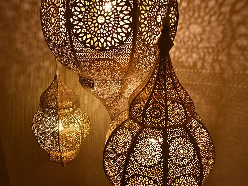 Tipp: Um die Lichteffekte auf den Fotos zu erzielen, haben wir für die Aufnahmen eine klare LED-Lampe verwendet. Diese strahlt direktes Licht aus, wodurch das Muster besonders gut an Wänden und Decke sichtbar wird. Wenn Sie eine sanftere Lichtwirkung bevorzugen, empfehlen wir Ihnen, Milchglaslampen zu verwenden. Dadurch wird das Licht diffuser und das Muster weniger stark betont – dennoch bleibt die 1001-Nacht-Atmosphäre in Ihrem Zuhause erhalten. Ganz gleich, welche Leuchtmittel Sie einsetzen, mit diesen Lampen wird es auf jeden Fall gemütlicher.