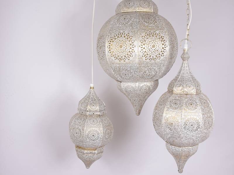 Diese orientalischen Hängelampen sind aus Metall gefertigt und haben filigrane, blumenförmige Muster, die wunderschön durchscheinen, wie Sie auf den Fotos sehen können. Es wirkt verspielt, wenn Sie jede Lampe in einer anderen Höhe aufhängen, sodass ein harmonisches Gesamtbild entsteht. Die Farbe kann als perlmuttartig beschrieben werden – ein eleganter Farbton namens „White Wash Gold“, der Ihrem Interieur mit Sicherheit einen glänzenden Akzent verleiht.