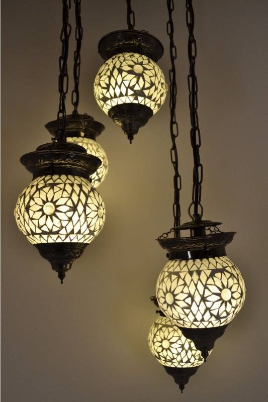 Große Hängeleuchte mit 5 Glühbirnen. Diese 5-Kugel-Hängeleuchte in transparenter Farbe ist mit fröhlichen Mosaikmustern verziert. Sie strahlt eine sehr gemütliche und stimmungsvolle Atmosphäre aus. Diese Mosaiklampen werden von Hand in Indien gefertigt und haben ein türkisches Design. Das bedeutet, dass sie mit Mosaik in Form von Dreiecken und großen Kugeln verziert sind. Die runde Deckenplatte ist orientalisch verziert und hat einen Durchmesser von 35 cm. Die Verkabelung ist schwarz, und in jedem Lampenschirm befindet sich eine Glühbirne mit einer kleinen Fassung von maximal 25 Watt.