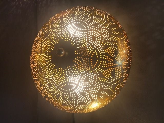 Orientalische Deckenleuchte in einer sehr warmen Farbe, Vintage Gold, die eine gemütliche Atmosphäre und Wärme schafft und auch sehr gut in einem industriellen Interieur mit all den Lochmustern an der Wand aussieht.Lesen Sie mehr