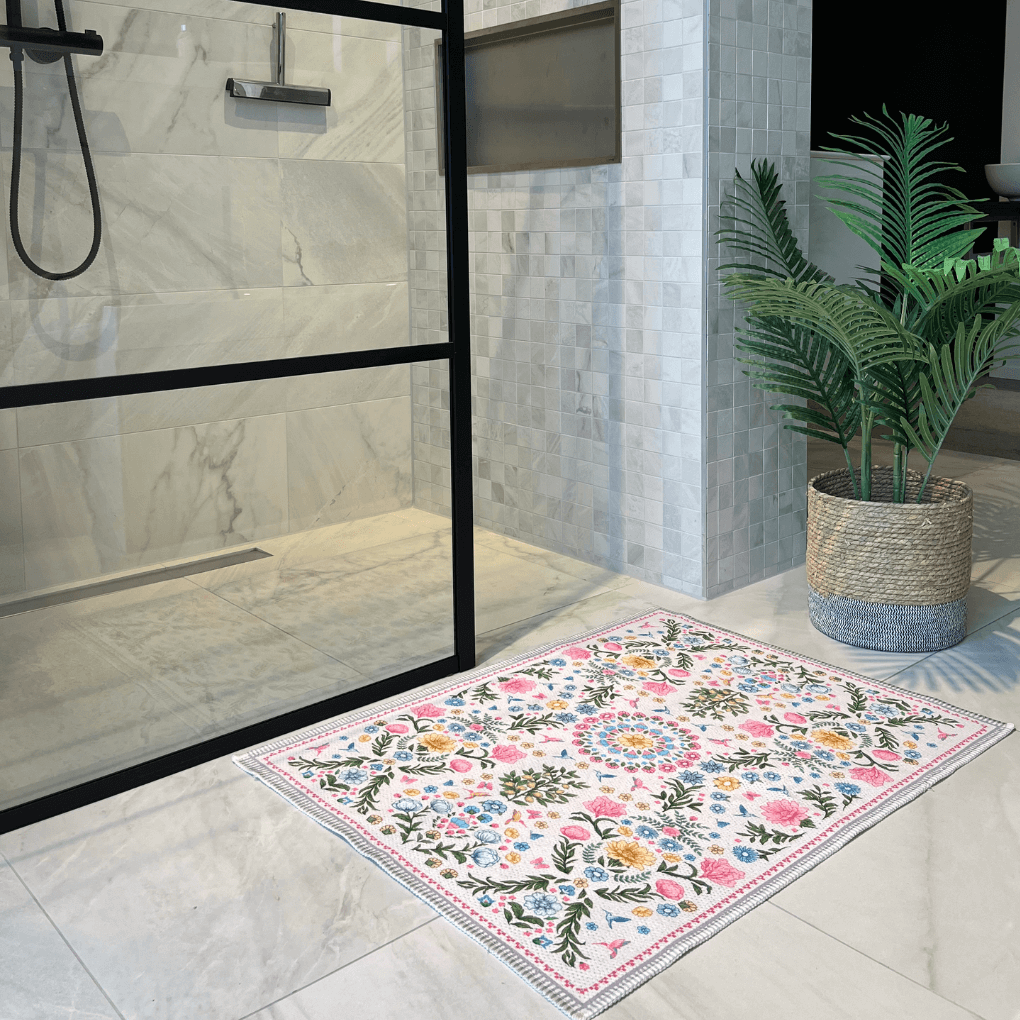 Stimmungsvoller Badeteppich mit weißem Hintergrund und fröhlichem Schmetterlings- und Blumenmotiv.Lesen Sie mehr