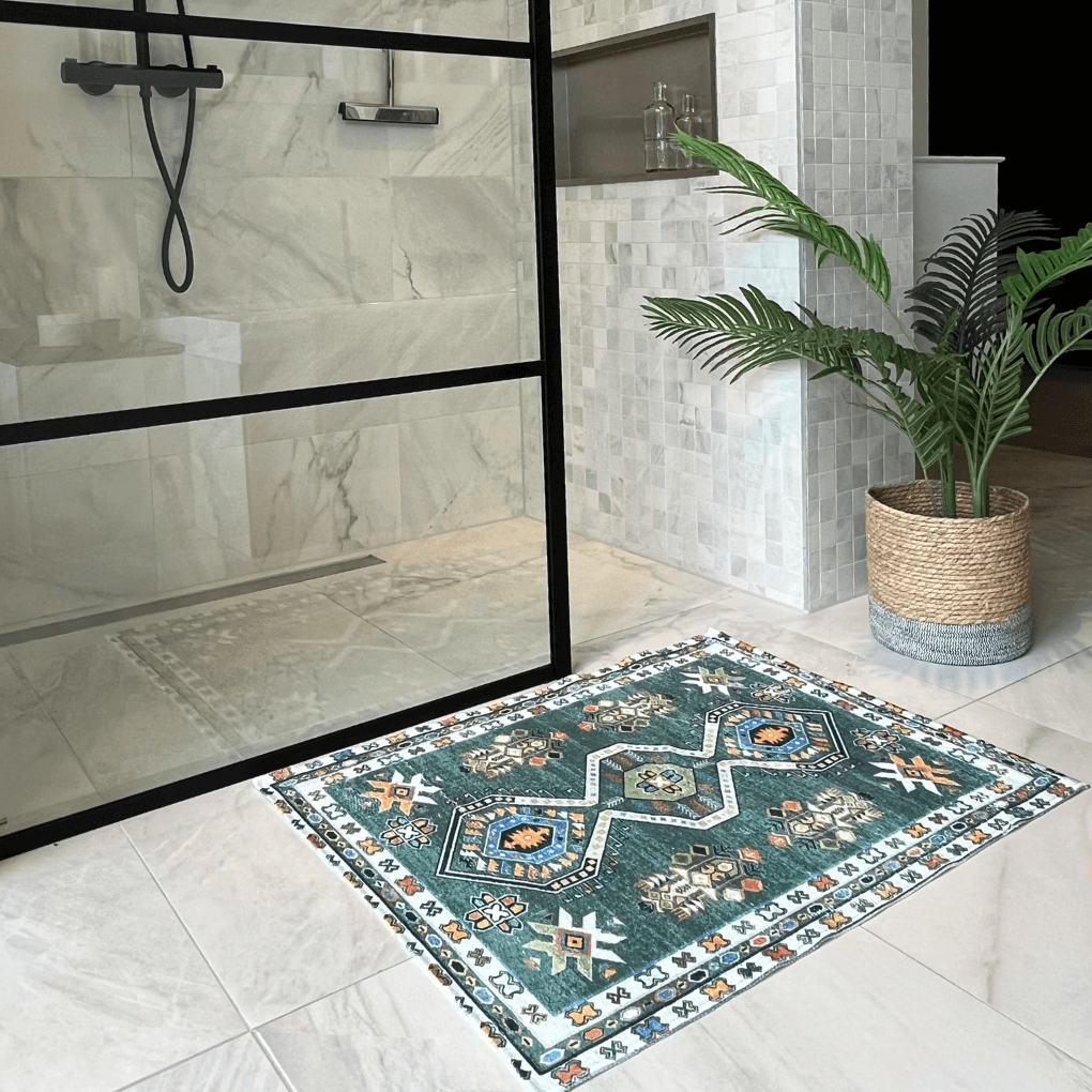 Eine stimmungsvolle Badematte mit unserem Aztek Green-Print, daher in einer wunderschönen grünen Farbe mit bunten Details! Mega cool im Badezimmer, aber auch als Fußmatte verwendbar. Lassen Sie dieses Muster durch das ganze Haus laufen, indem Sie unsere Badematte, den Außenteppich, Kissen usw. kombinieren.