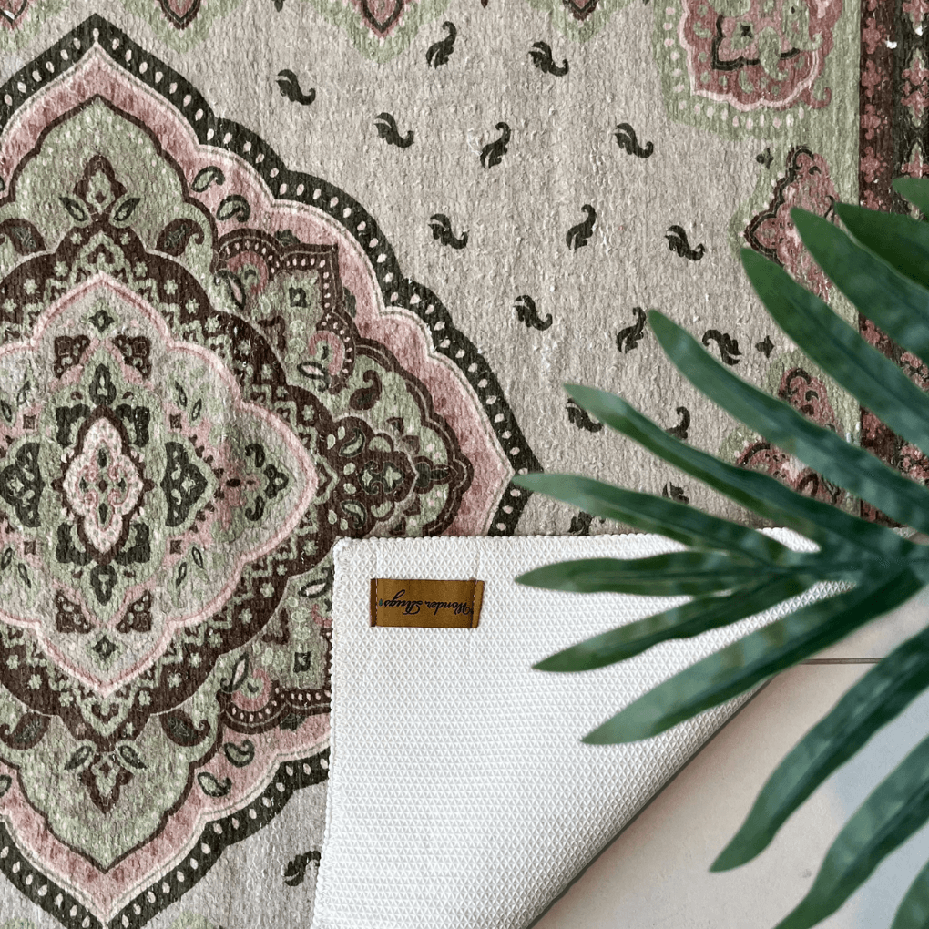 Ein stimmungsvoller Badteppich mit unserem Mila-Druck in einer sanft grünen, beigeartigen Farbe - eine wirklich gemütliche Ergänzung für dein Zuhause! Mega cool im Badezimmer, aber auch als Fußmatte verwendbar. Lass dieses Muster im ganzen Haus wirken, indem du unseren Badteppich, den Pouf und den Außenteppich kombinierst.