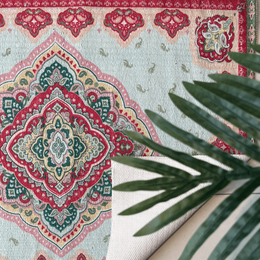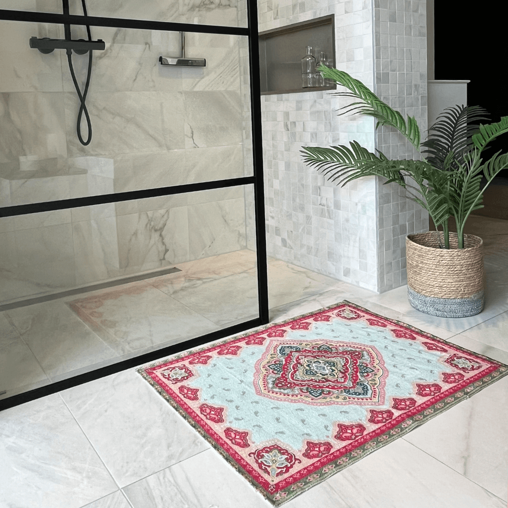 Pastellfarbene Rosenkelim-Badematte oder Türmatte.