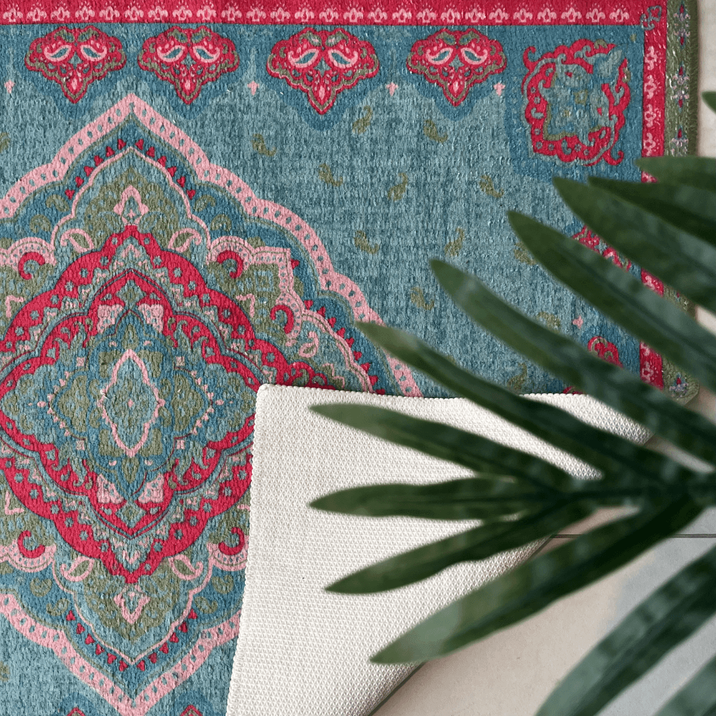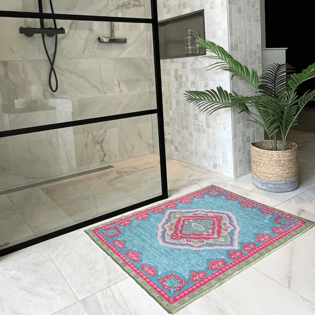 Versier dein Badezimmer mit diesem farbenfrohen Badteppich. In leuchtendem Blau und mit anderen bunten Details versehen, wird er zu einem echten Blickfang in deinem Badezimmer. Schaffe Einheit, indem du den Badteppich mit dem Außenteppich und dem Kissen im gleichen Muster kombinierst.