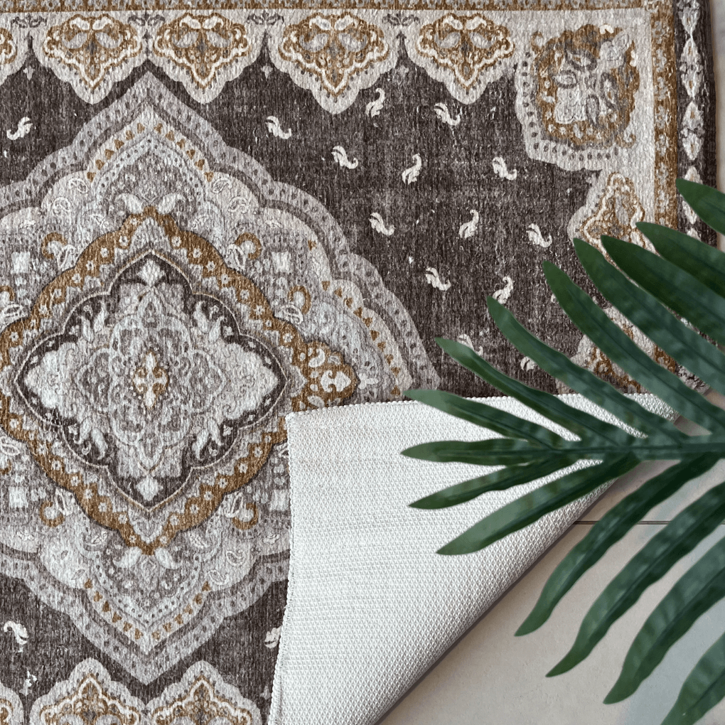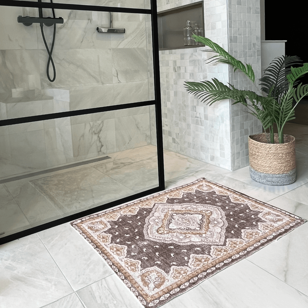 Stimmungsvoller Badteppich in warmem Braunton mit Details in sanften Farben. Ein echter Blickfang in deinem Badezimmer!Lesen Sie mehr