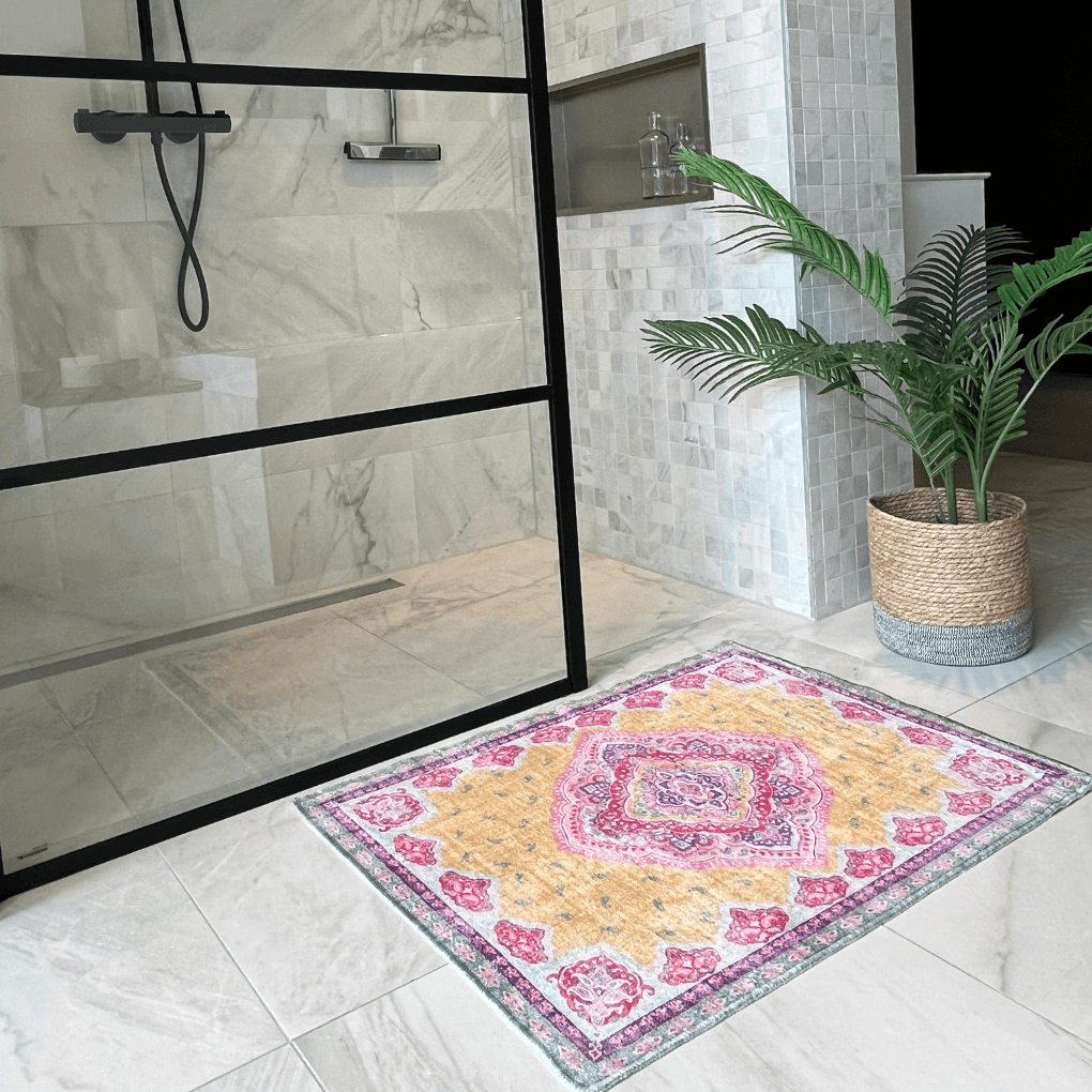 Froher Badteppich in schöner Gelbfarbe und lebhaften, bunten Details. Perfekt, um dein Badezimmer aufzufrischen und einen farbenfrohen Akzent zu setzen!Lesen Sie mehr