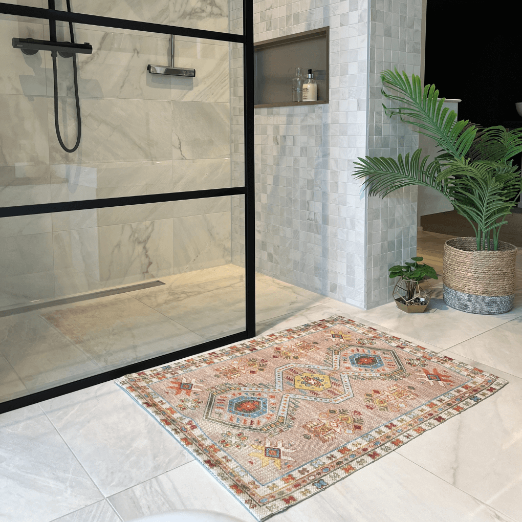 Die schönen rosa Badematten sind wieder da und diesmal mit den lebhaften Farben darauf gedruckt. Sie können auch als kleiner Teppich oder Türmatte verwendet werden - das ist ein gemütliches Heimkommen. Die farbenfrohen Rosen springen von dem schwarzen Hintergrund ab. Ein wirklich romantisches Stück für zu Hause.