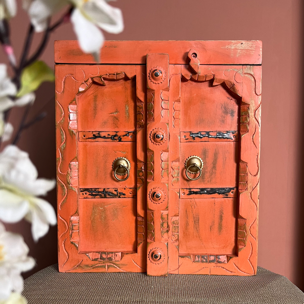 Ein atmosphärischer Badezimmerschrank, versehen mit einer lebhaften lachsrosa Farbe und schönen Details, die durch echte Holzschnitzereien entstanden sind.Lesen Sie mehr