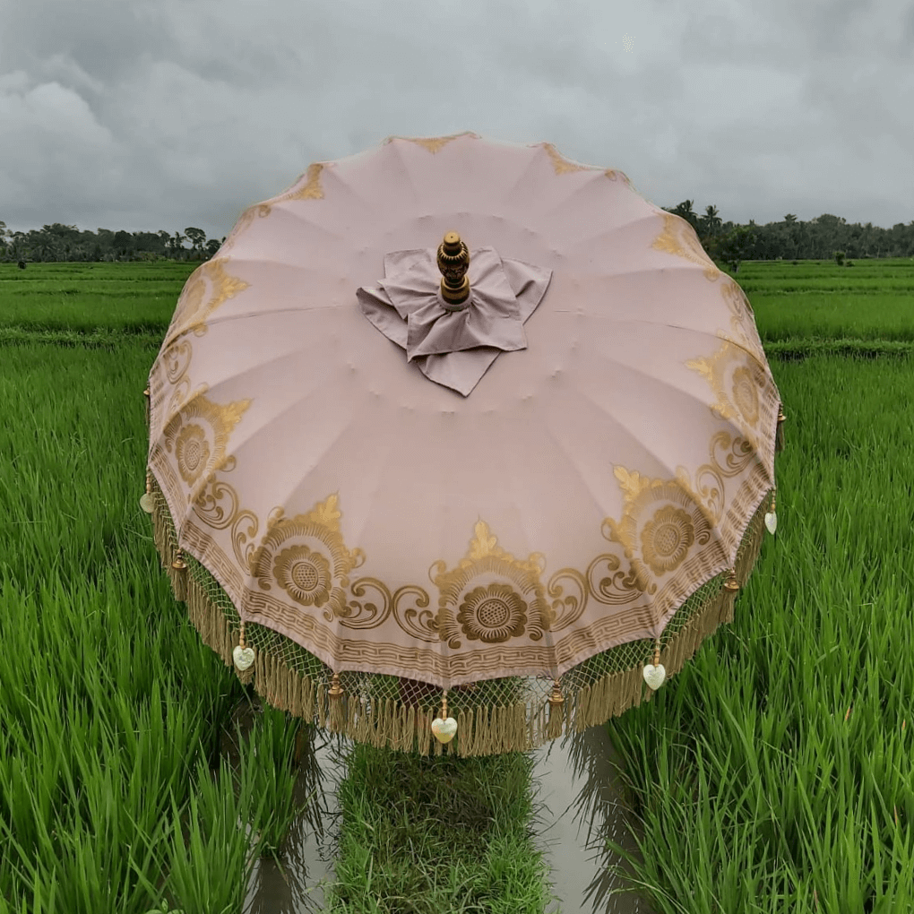 Ein Sonnenschirm aus dem wunderschönen Bali mit luxuriöser Ausstrahlung. Die Verarbeitung dieses Sonnenschirms ist wunderschön, in einem warmen Taupe-Farbton und mit goldenen Akzenten! Der Stock besteht aus lackiertem Holz und Goldmalereien. Diese goldenen Akzente werden von Hand aufgemalt.