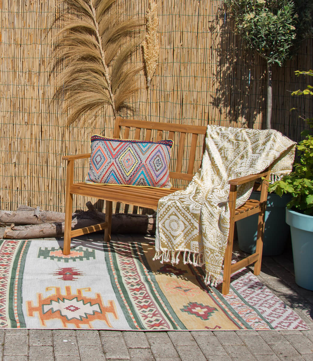 Schaffen Sie mit diesem schönen Kelim-Außenteppich eine Boheème-Atmosphäre im Garten, und ja, Sie sehen richtig, er ist nicht aus geflochtenen Plastikhalmen. Der Teppich besteht jedoch aus PET, sieht und fühlt sich jedoch wie echter Stoff an. Das Muster ist in den Farben Beige und Braun gehalten und wirkt wie ein Teppich für den Innenbereich neben der Loungebank.