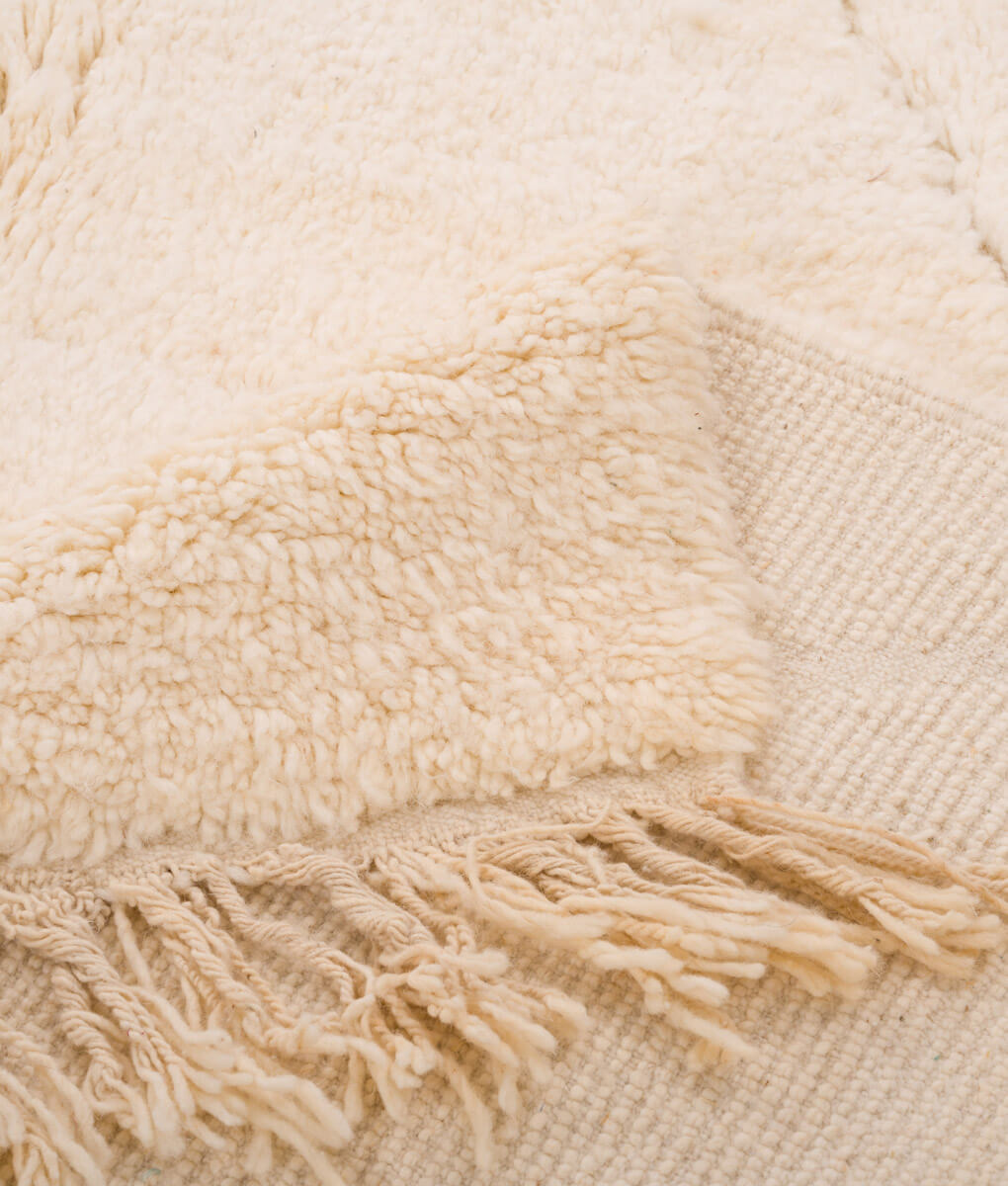Das bekannte Wieber-Muster wurde in diesen wunderschönen elfenbeinfarbenen Teppich eingearbeitet, der im Atlasgebirge in Marokko handgefertigt wurde. Ein Wollteppich ist wunderbar weich und warm unter den Füßen und passt in viele Einrichtungsstile.