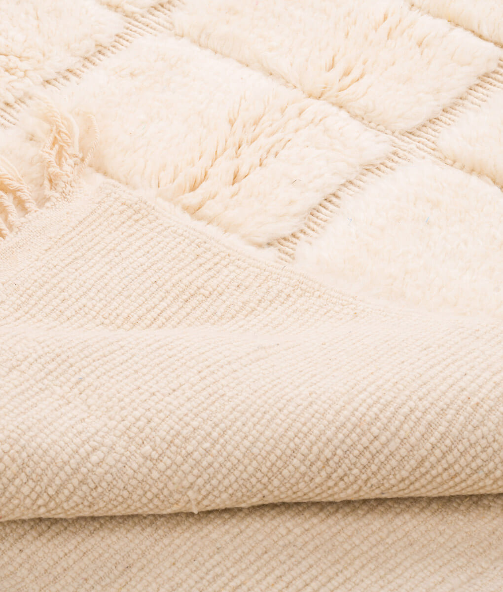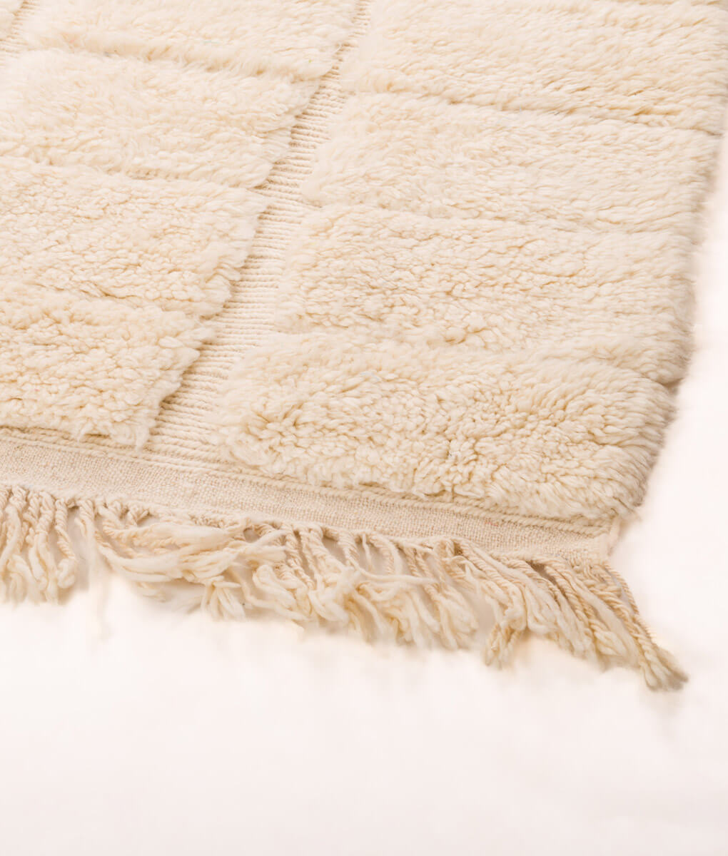 Spezieller moderner geschorener Berberteppich aus Marokko aus elfenbeinweißer Wolle und Quasten darauf,Lesen Sie mehr