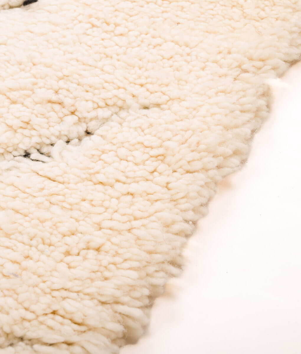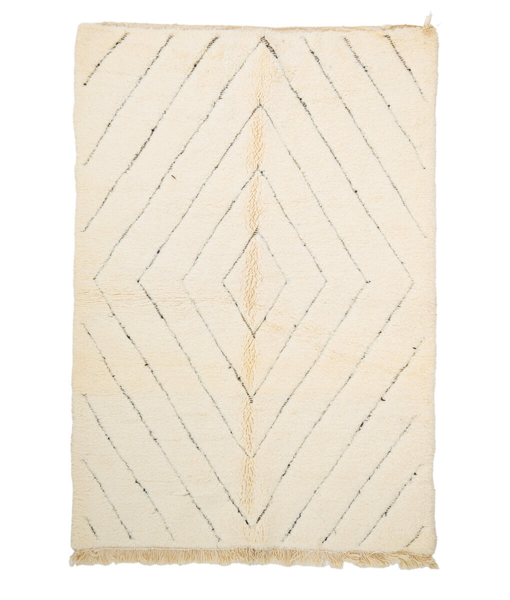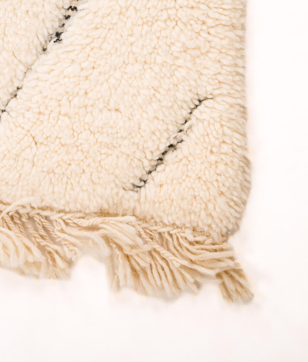 Zeitloser und warmer Wollteppich von Beni Ouarain in einem wunderschönen Dreiecksdesign, rasiert, das in der Mitte ein Unkrautmuster bildet, und schwarze Farben in den rasierten Teilen. Ein echter elfenbeinweißer Wollteppich, der sowohl zu einem modernen als auch zu einem klassischen Interieur passt und von Berberstämmen im Atlasgebirge in Marokko handgefertigt wurde. Beni Ouarain ist für seine asymmetrischen Muster bekannt.