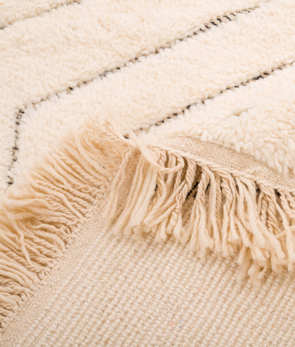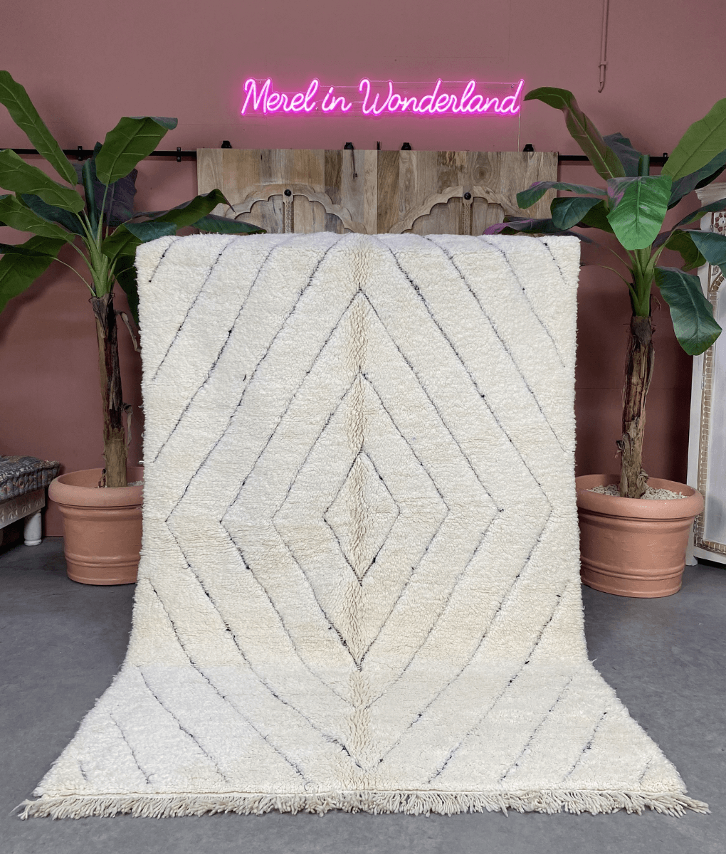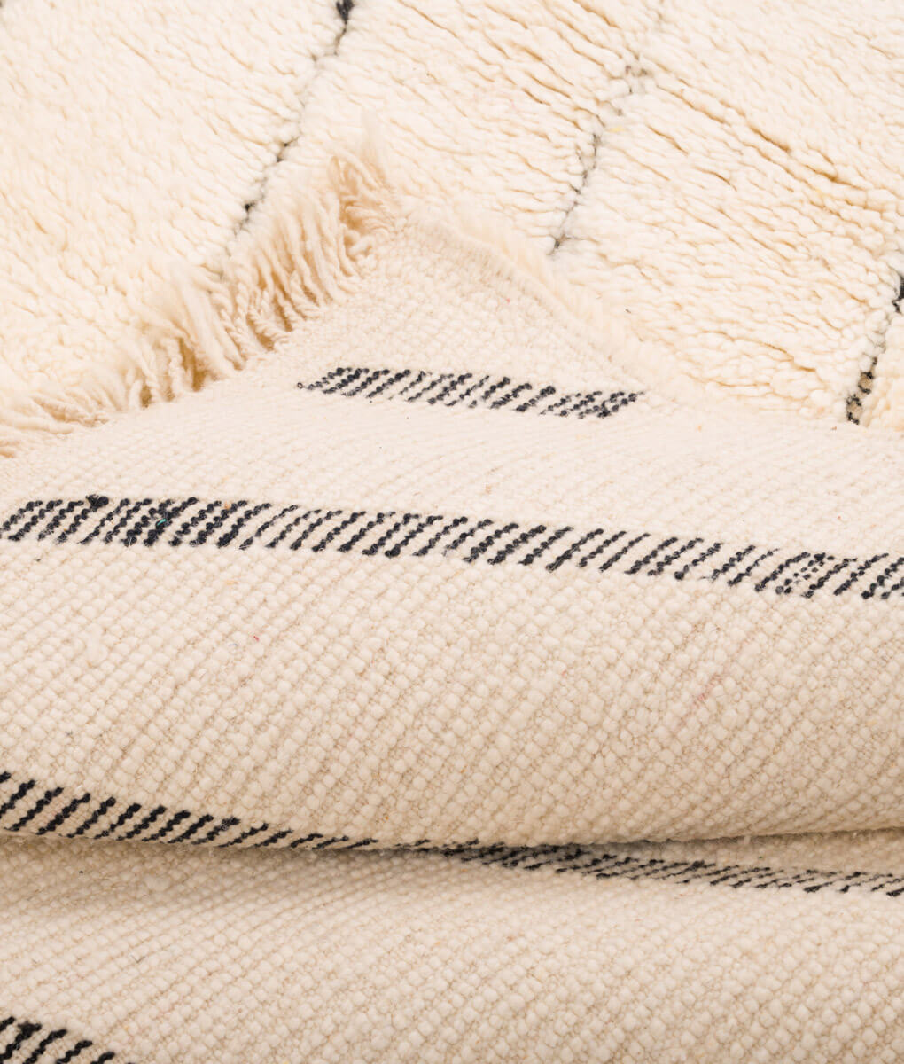 Zeitloser und warmer Wollteppich von Beni Ouarain in einem wunderschönen Dreiecksdesign, rasiert, das in der Mitte ein Unkrautmuster bildet, und schwarze Farben in den rasierten Teilen. Ein echter elfenbeinweißer Wollteppich, der sowohl zu einem modernen als auch zu einem klassischen Interieur passt und von Berberstämmen im Atlasgebirge in Marokko handgefertigt wurde. Beni Ouarain ist für seine asymmetrischen Muster bekannt.
