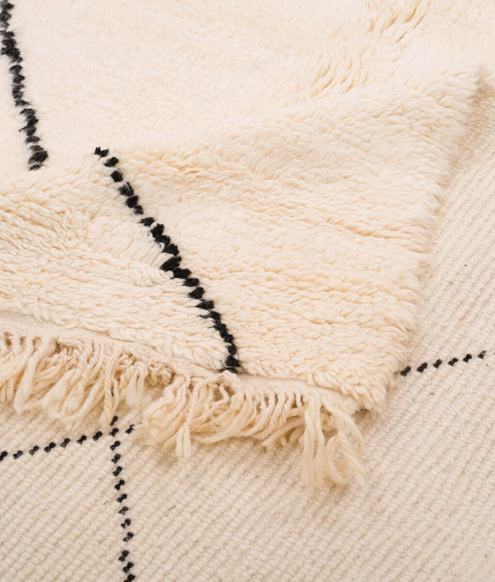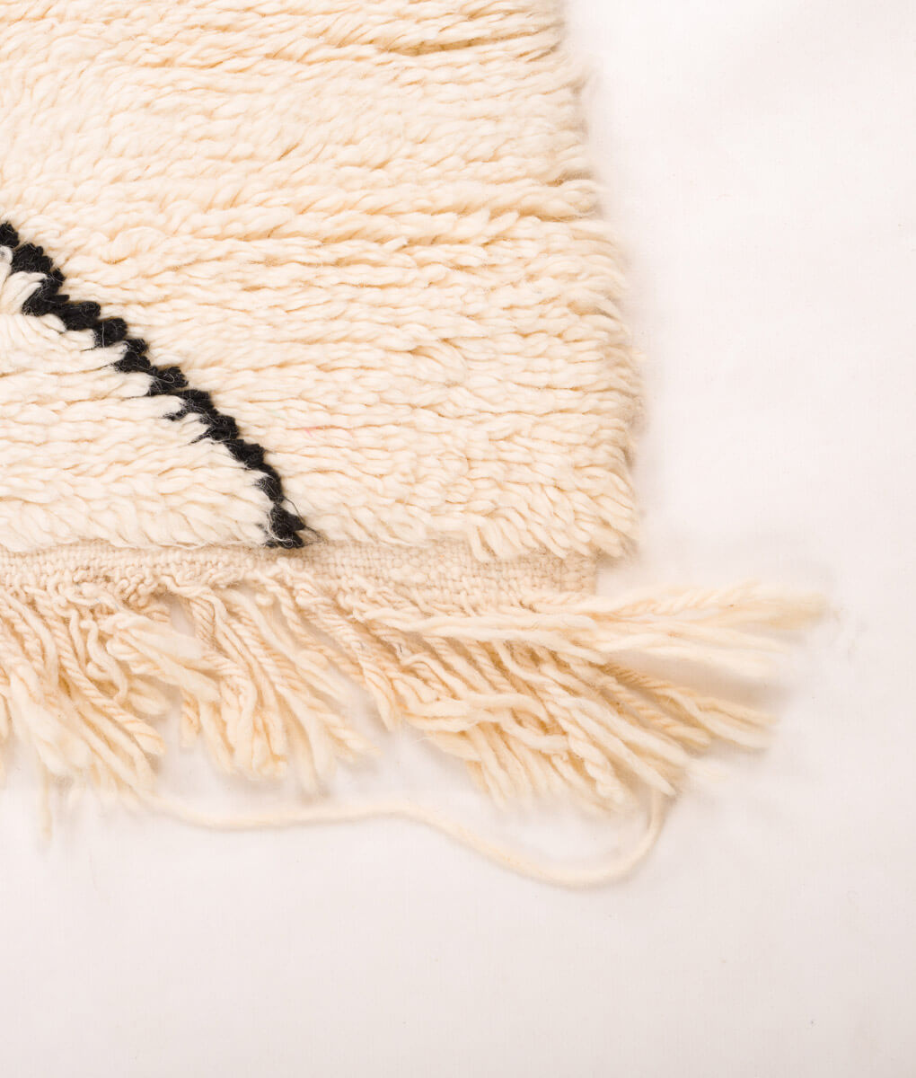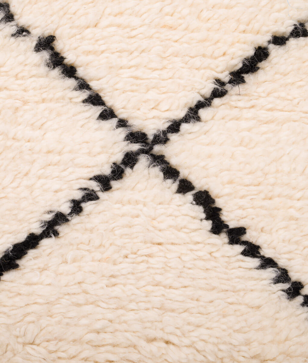 Schwarze Muster in Wieber-Muster sehen aus wie ein echter Beni Ouarain-Teppich, handgefertigt im Atlasgebirge in Marokko. Es bleibt ein zeitloses und modernes Muster und lässt sich auch wunderbar mit diesem Stil kombinieren. Der Berber ist eine schöne und weiche Wolle für das Sofa.