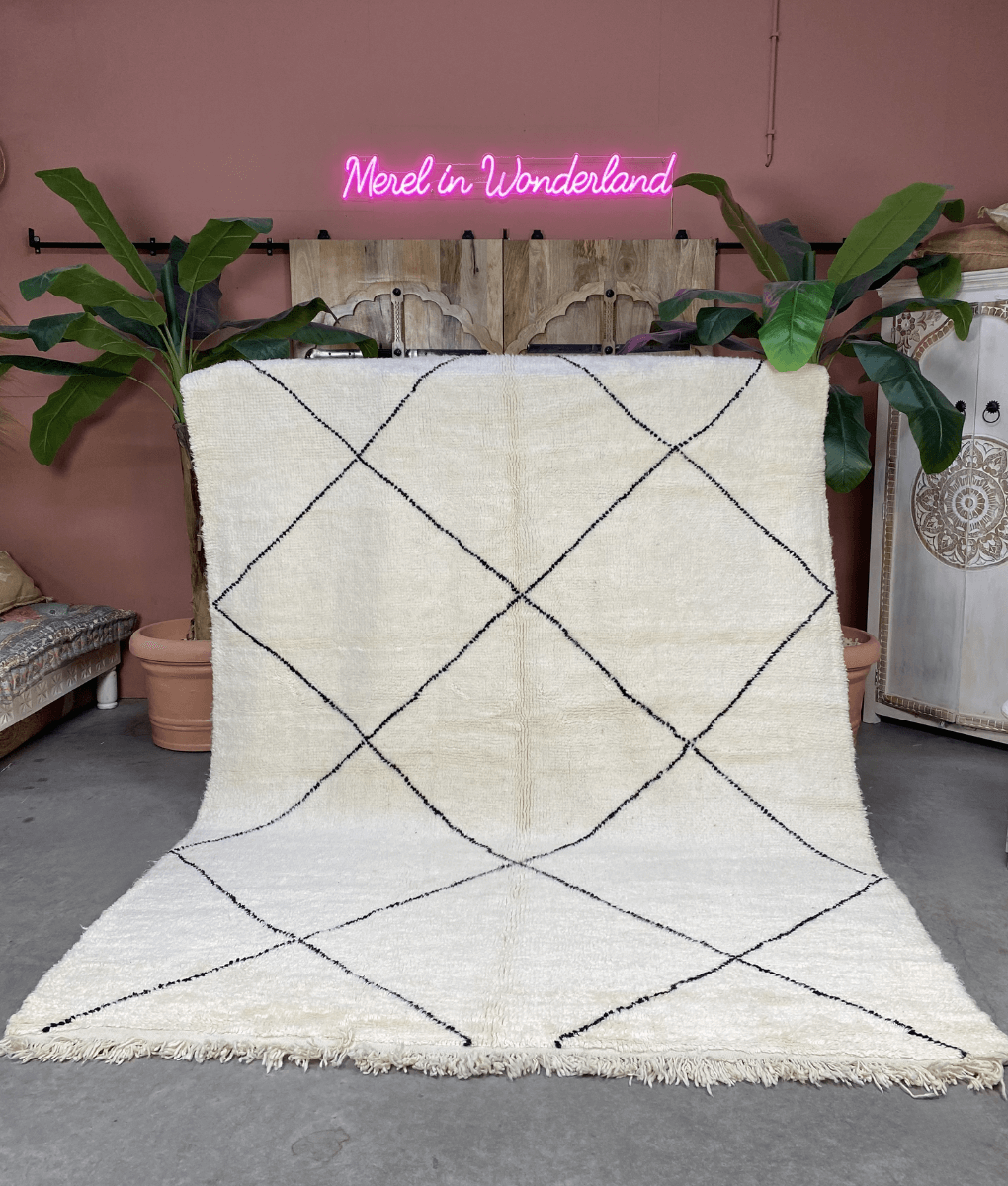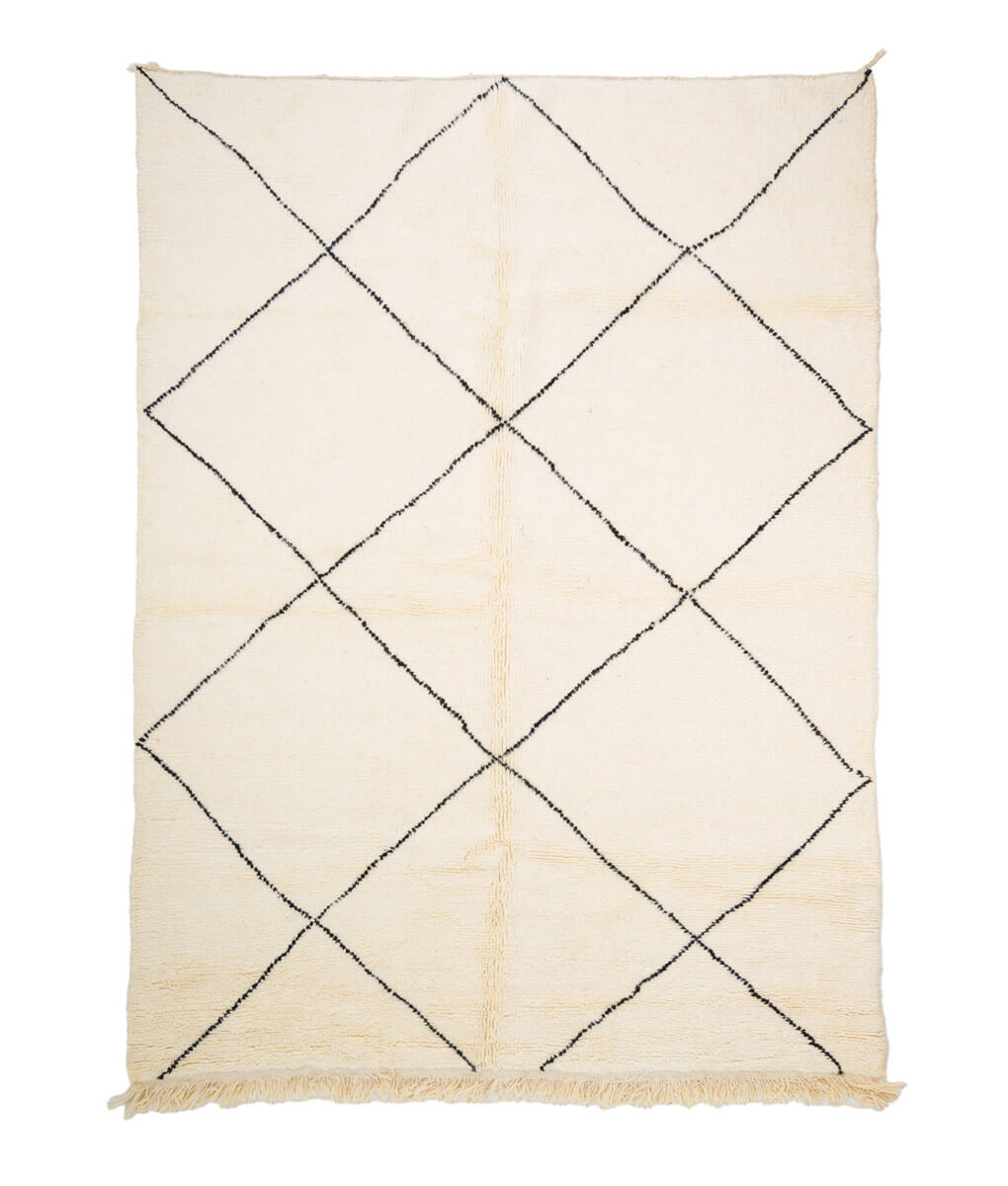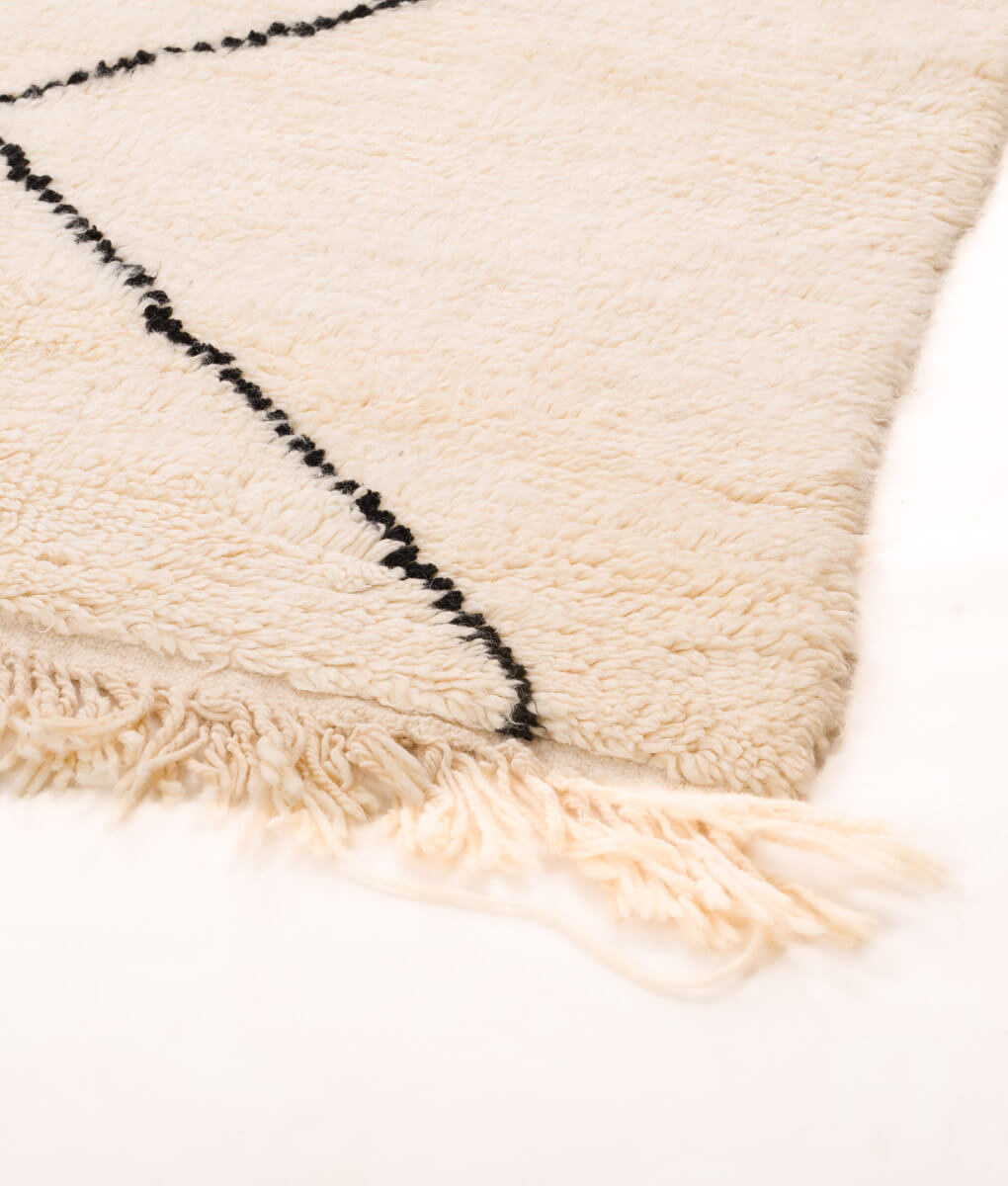 Schwarze Muster in Wieber-Muster sehen aus wie ein echter Beni Ouarain-Teppich, handgefertigt im Atlasgebirge in Marokko. Es bleibt ein zeitloses und modernes Muster und lässt sich auch wunderbar mit diesem Stil kombinieren. Der Berber ist eine schöne und weiche Wolle für das Sofa.
