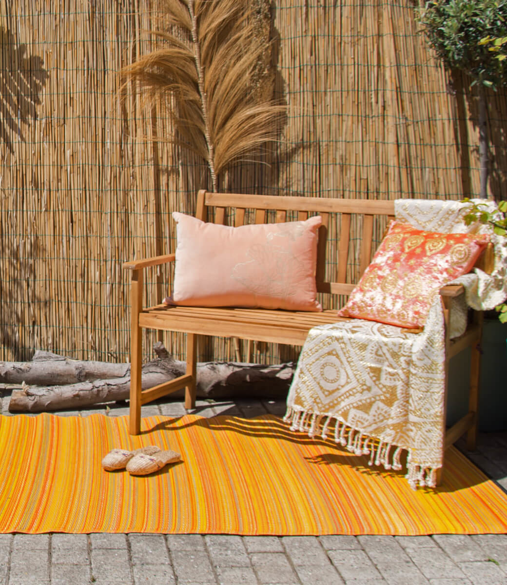 Ein warmes, sonniges Teppich aus ineinander geflochtenen Kunststoffsträngen in warmem Ocker und Orange. Dieser Teppich ist für den Garten geeignet, kann beidseitig verwendet werden und ist von hoher Qualität mit UV-Schutz. Er liegt flach auf dem Boden und ist leicht aufrollbar. Er verleiht Ihrem Garten eine warme Atmosphäre, perfekt zum Entspannen und Träumen. Beachten Sie, dass der Baumwollrand nicht schwarz ist, wie auf dem Foto, sondern beige.