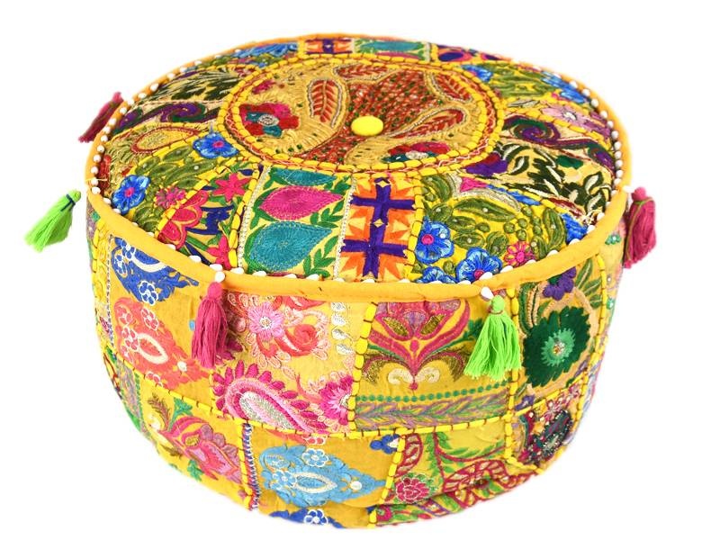 Patchwork Indischer Gelber Pouf aus recyceltem Material.