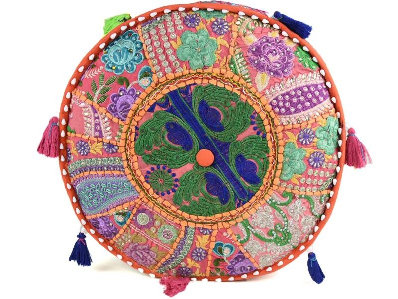Dieses orangefarbene runde Pouf ist an sich schon fröhlich! Doch durch die rundum aufgenähten bunten Quasten wirkt es noch mehr wie ein indisches orangefarbenes Pouf. Es sind Patchwork-Stücke aus alten Sari-Stoffen darauf genäht, auf denen Sie weitere Farben wie Gelb, Grün, Lila usw. finden. Da sie handgefertigt sind, sind sie einzigartig. Jedes Pouf ist ein kleines Kunstwerk für sich, und das Foto auf der Website dient als Beispiel dafür, wie es aussieht. Das Pouf, das Sie erhalten, kann also möglicherweise andere Farben und Perlen haben, da es handgefertigte Poufs sind. In der Mitte ist eine orangefarbene Baumwollknopf angenäht.