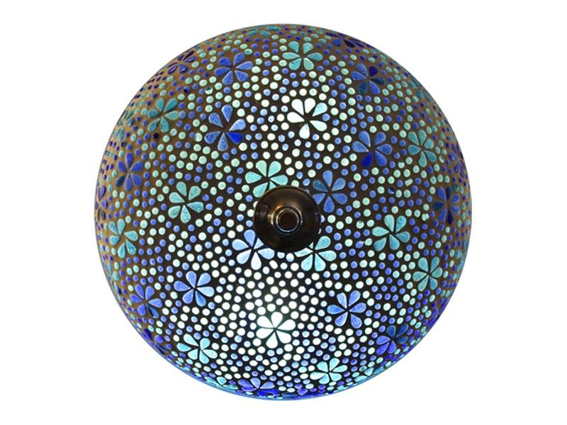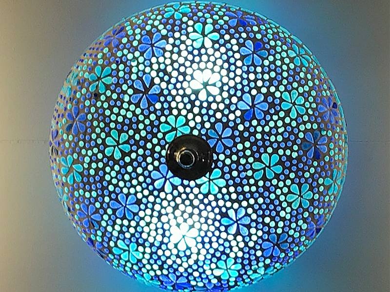 Neue Design-Deckenleuchte mit einem Durchmesser von 24 cm, aus Glasmosaik aus Indien. Handgelegte Glasstropfen in weißem Fugenmaterial schmücken die Oberfläche. In der Mitte befindet sich ein Blumenmuster aus blauen und türkisen Steinen, die hell durchscheinen. Der Rand ist komplett türkis gefärbt, so dass ein hellblaues Farbthema vorherrscht. An der Rückseite befinden sich Stücke gebrochenen Glases, ebenfalls in den beiden Blautönen, was sie zu einem echten Kunstwerk macht und nur in begrenzter Stückzahl erhältlich ist. Wenn die Lampe am Abend eingeschaltet wird, leuchtet nur noch das Glas durch, und das weiße Fugenmaterial wird dunkel, da es kein Licht durchlässt.
