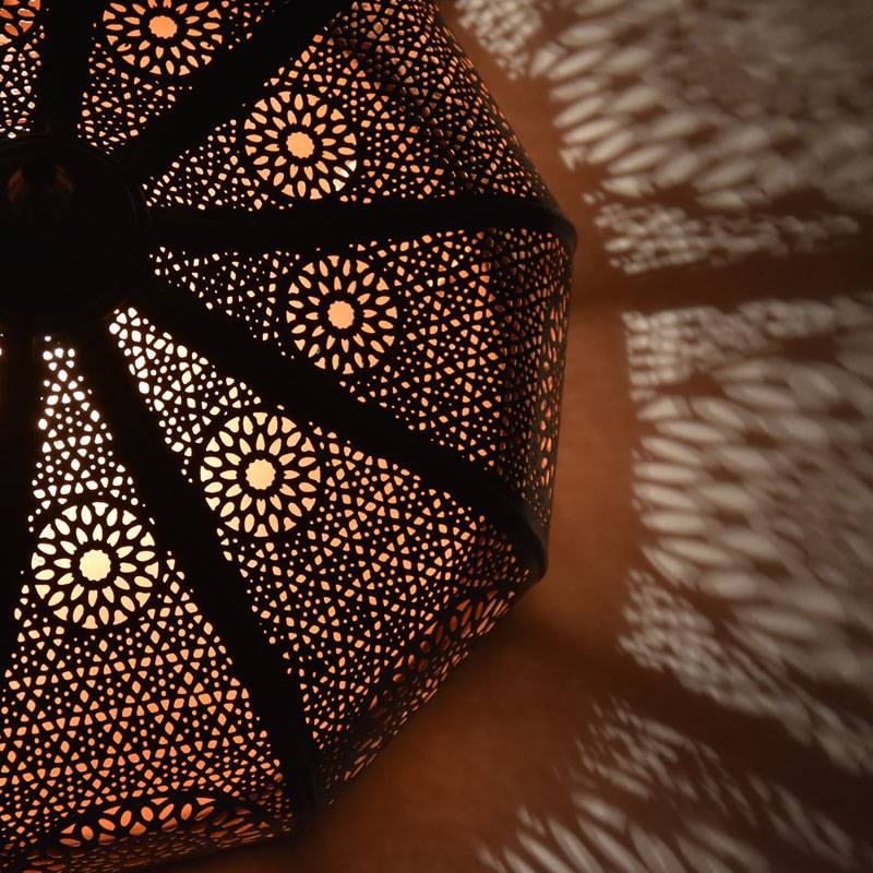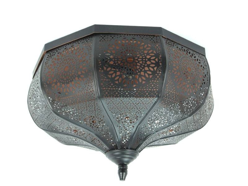 Matt-schwarze Metall-Filigran-Deckenleuchte mit einer goldenen Innenseite, die eine stimmungsvolle und gemütliche Beleuchtung bietet, wenn die Lampe eingeschaltet ist. Tagsüber ist sie ein Schmuckstück an Ihrer Decke und wirkt elegant mit Blumenmustern rundherum und einer orientalischen Stil im mittleren Teil. Diese Deckenlampe hat eine marokkanische Atmosphäre durch die feine Metallverarbeitung, sodass keine groben Löcher vorhanden sind. Dadurch verteilt sich das Licht schön und die Lampe glänzt an der Decke.