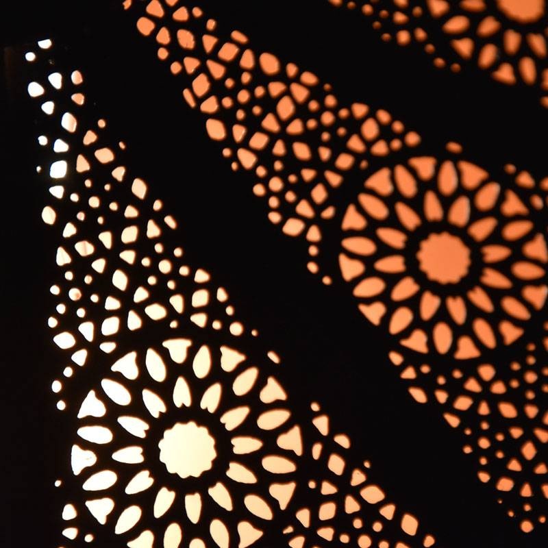 Matt-schwarze Deckenleuchte mit kupfernen Filigranmustern.