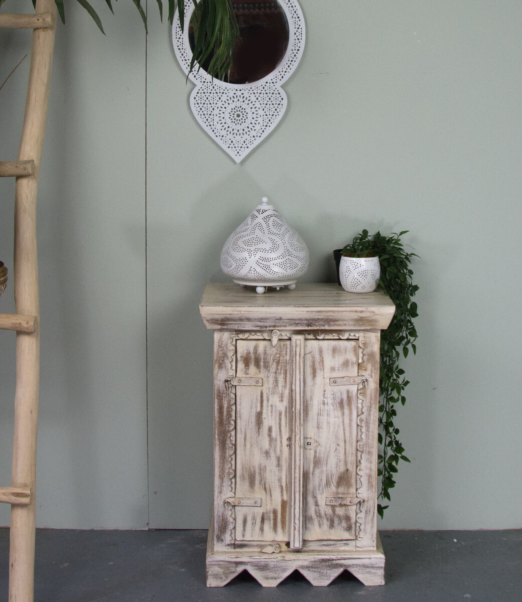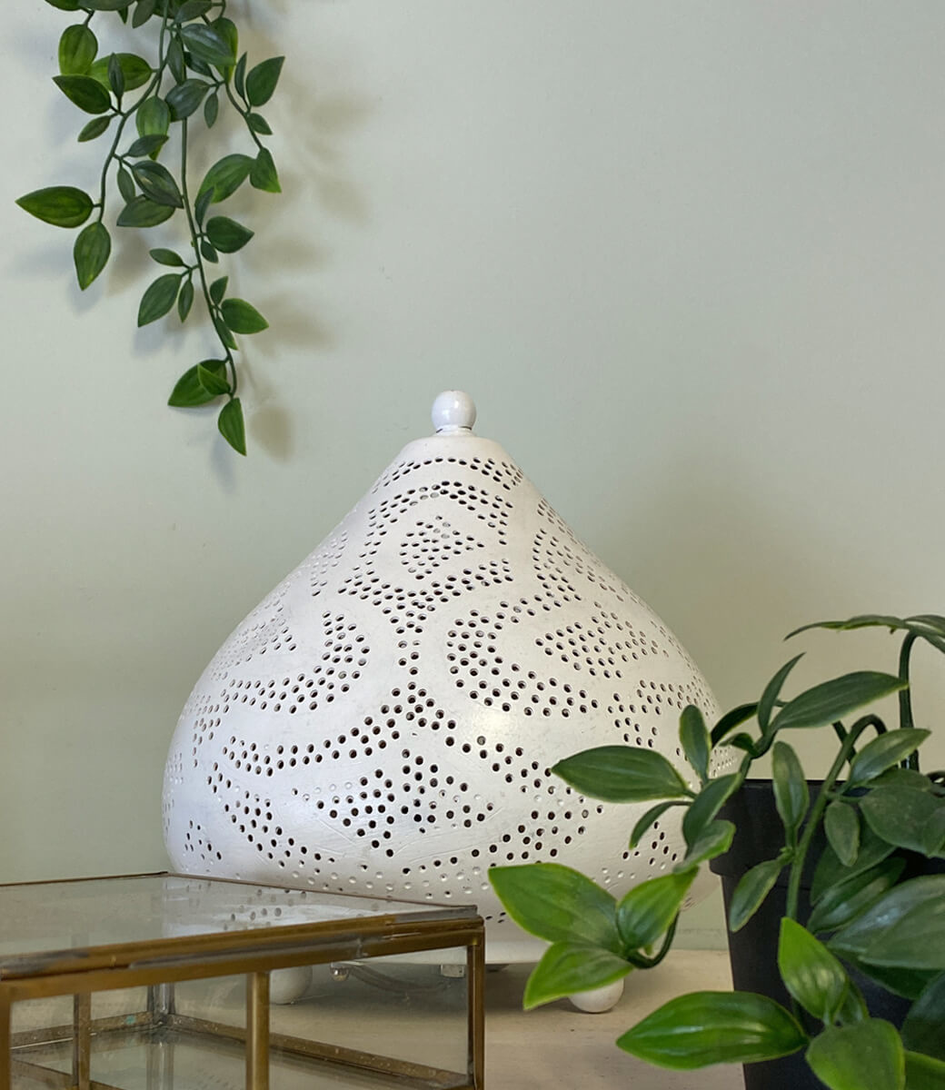 Eine "Weiße kleine Tischlampe" mit weißen runden Beinchen, damit auch von unten Licht herauskommt. Im Inneren ist die Lampe goldfarben, wodurch warmes Licht durchscheint. Tagsüber sind die orientalischen Linien im Metall sichtbar und erzeugen einen schönen Effekt. Alle kleinen runden Löcher bilden zusammen auch ein Muster, das abends schön durchscheint.