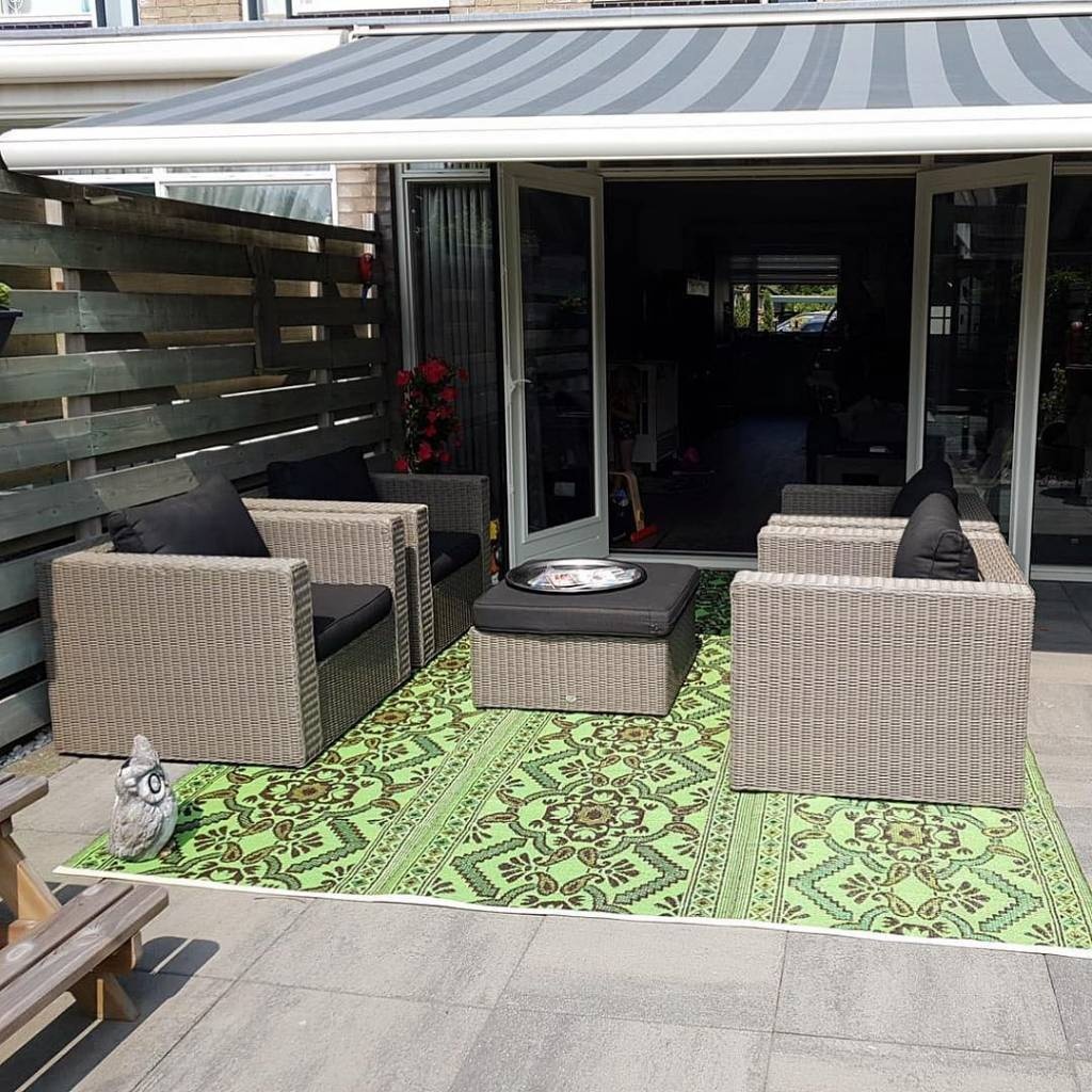 Denken Sie auch an Kinder und Haustiere, die draußen spielen und liegen möchten. Oft werden die Fliesen auf der Terrasse sehr heiß, und dieser extra große Außenteppich wird von der Sonne warm und weich, ideal zum Spielen. Auch für eine große Gartenparty ist ein Teppich in dieser Größe gleich eine Atmosphäre-Schöpfer bei der Partyzelt. Es schafft sofort eine gemütliche Fläche und mit ein paar Poufs darauf haben Sie Ihren eigenen Loungebereich im Freien. Der Teppich ist aus Kunststoff, also leicht zu reinigen. Und wenn er verstaut werden muss, einfach zusammenfalten. Beachten Sie, dass der Teppich beidseitig verwendbar ist, mit einer dunkelgrünen Seite und einer hellgrünen Seite