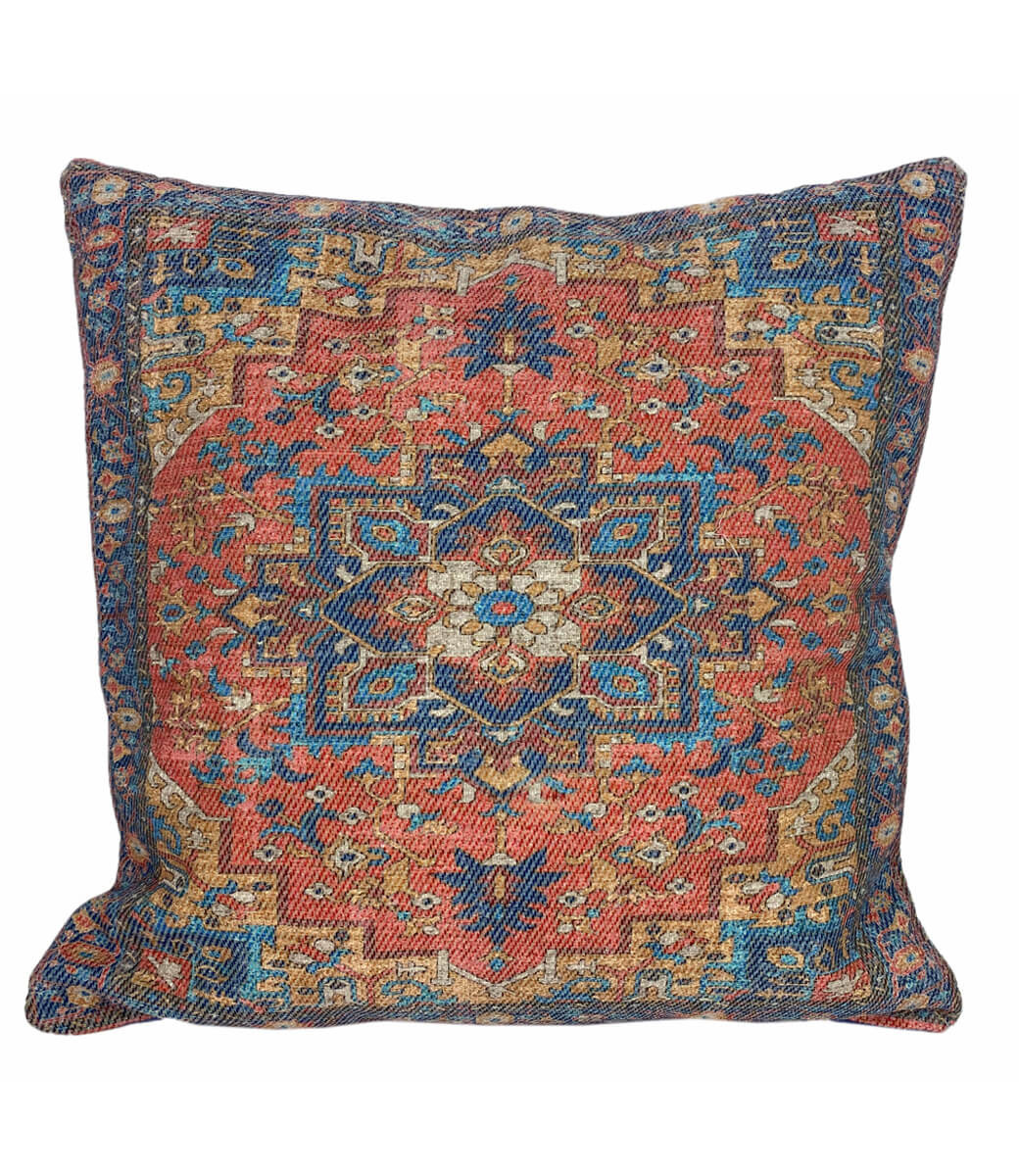 Farbenfrohes Zierkissen aus robustem recyceltem Baumwollstoff mit einem orientalischen Vintage-Kelim-Muster und Herbstblättern. Die Farben sind intensiv und fröhlich, haben jedoch einen Vintage-Old-Look mit warmen Tönen. Die Größe beträgt 50 cm und eignet sich hervorragend zum Entspannen auf dem Sofa oder als dekoratives Kissen auf dem Bett. Passend dazu sind auch Armrollen, Matratzen und sogar ein Teppich erhältlich, alles inklusive stabiler Füllung. Der Druck befindet sich auf einer Seite, die andere Seite ist aus Baumwolle mit Reißverschluss.