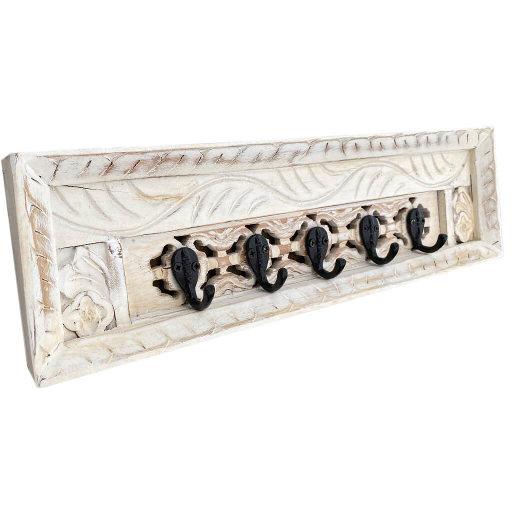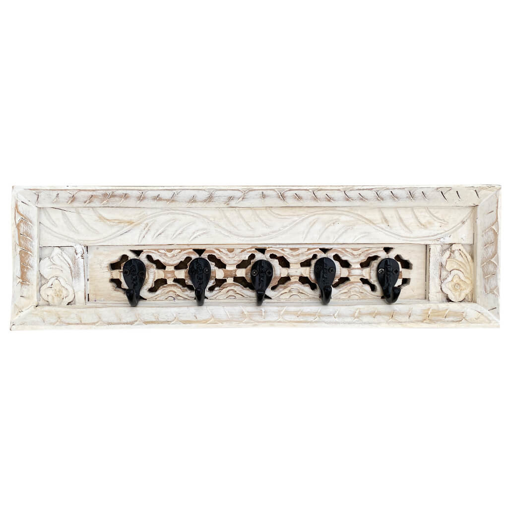 Weiße Garderobe mit 5 Haken zum Aufhängen von Kleidung, handgefertigt in Indien mit wunderschöner Holzschnitzerei.