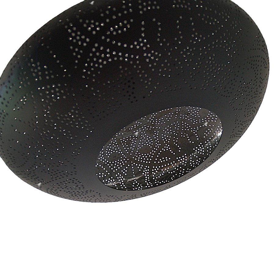 Diese filigrane Hängelampe hat eine schöne flache runde Form, sodass Sie diese Hängelampe problemlos aufhängen können, ohne dass sie im Weg hängt. Keine Türen, die dagegen schlagen, oder dass Sie sich den Kopf stoßen, so wie es bei Deckenleuchten der Fall ist. Die äußere Oberfläche der filigranen Hängelampe ist matt schwarz, und die Innenseite ist wunderschön mit einem silberblättrigen Look verziert, wodurch das Licht hindurch funkelt. Aufgrund der metallischen Verarbeitung mit anmutigen Mustern durch kleine Kreise, die darin eingearbeitet sind, erzeugt diese Hängelampe an der Decke und an der Wand anmutige Muster. Da die orientalische Lampe oben flach ist, können Sie, wenn Sie sie nahe an die Decke hängen, einen wirklich märchenhaften Effekt erzielen.