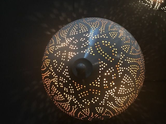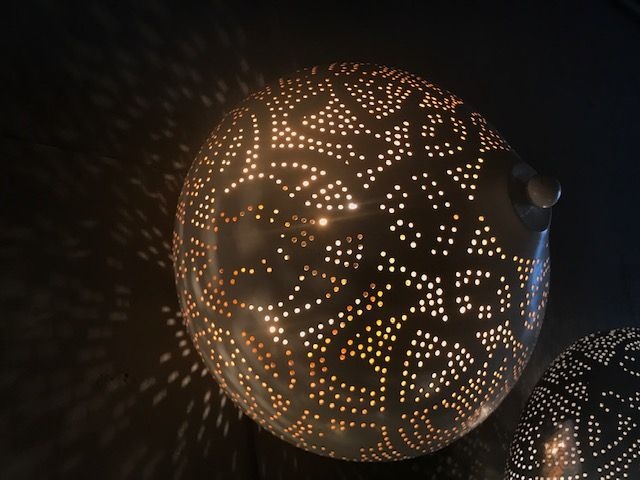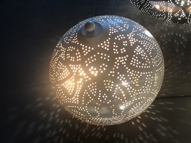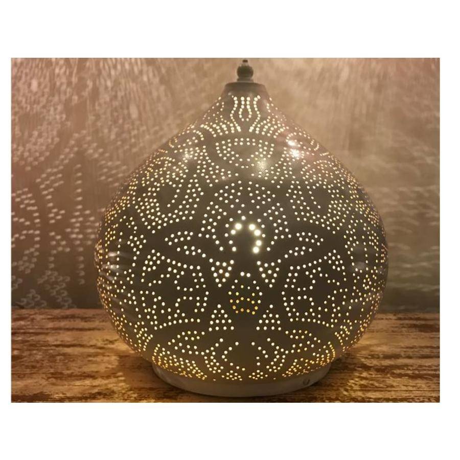In dieser Serie weißer Lampen haben wir auch passende Hängelampen, Tischlampen und Teelichter, damit Sie den Stil im gesamten Haus beibehalten können. Die Lampen werden in Indien handgefertigt, und mit der Punkttechnik werden orientalische Muster eingearbeitet, die wirklich wunderschön an der Wand durchscheinen.