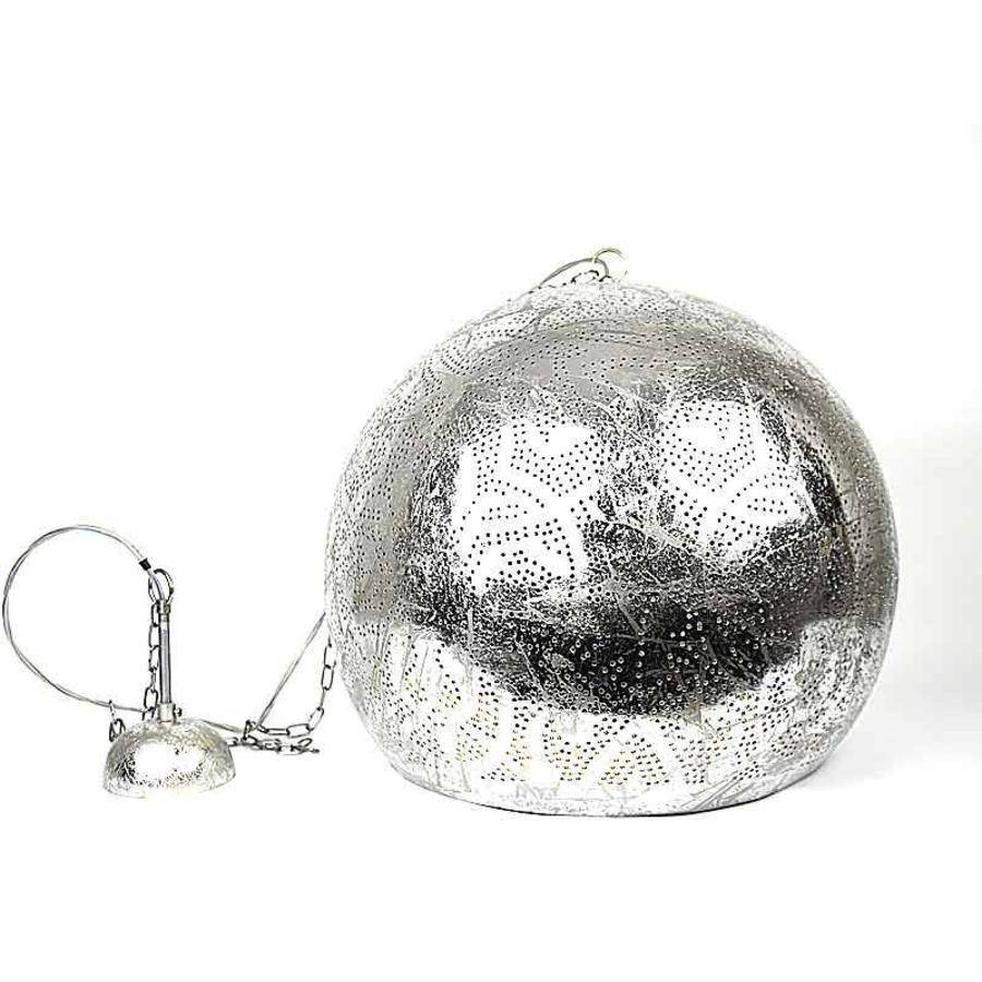 Filigrane Hängelampe in Kugelform, ideal als Esstischlampe zu verwenden, da die Unterseite offen ist und Licht auf die Oberfläche abgibt. Sie besteht aus Metall und erfordert daher keine besondere Pflege. Die Farbe ist antikes Silber mit einem Vintage-Look und verleiht Ihrem Interieur definitiv eine orientalische Atmosphäre. Es sind viele kleine Löcher eingearbeitet, die zusammen einen märchenhaften Effekt erzeugen, wenn die Lampe abends eingeschaltet wird. Sie sehen dann orientalische Muster, die die Punkte zusammen wie in 1001 Nacht so schön an die Wand strahlen lassen.