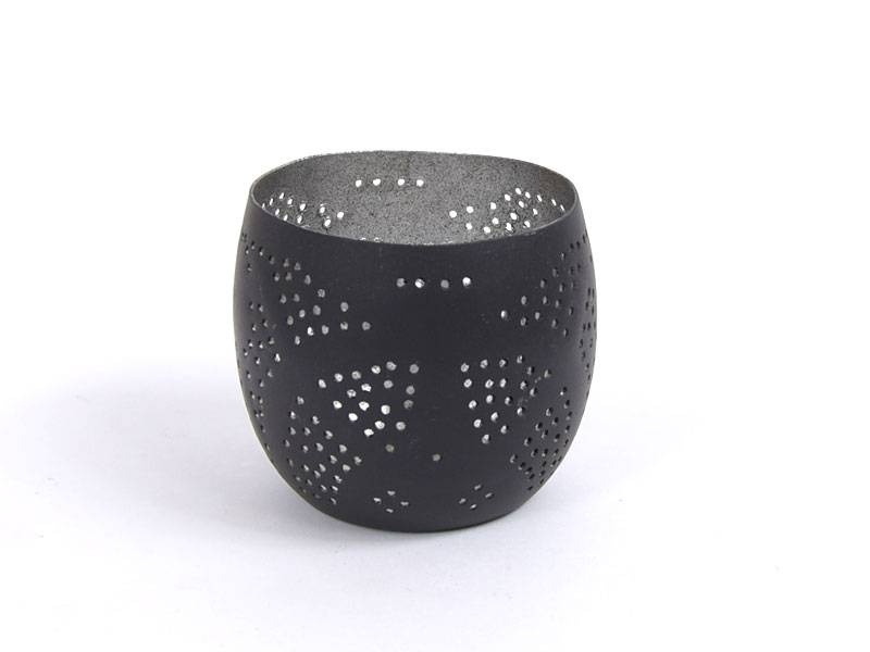 Stimmungsvoller filigraner Teelichthalter aus Metall in Schwarz mit silberner Innenseite und schönen Mustern durch die Löcher, die hindurchscheinen.Lesen Sie mehr