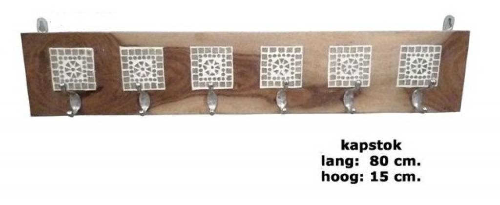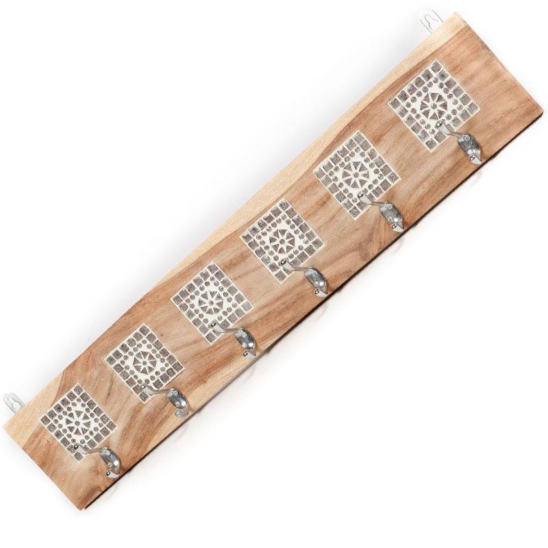 Holzorientierte Garderobe, in Indien hergestellt, mit 6 silberfarbenen Haken, damit jeder seine Jacke an der Garderobe aufhängen kann. Es sind 6 transparente Glasmosaikfliesen enthalten, um eine orientalische Atmosphäre zu schaffen. Die Garderobe ist auch in Multicolor erhältlich