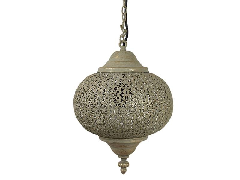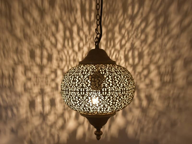 Goldbraune kleine orientalische Hängelampe mit filigranen Mustern.