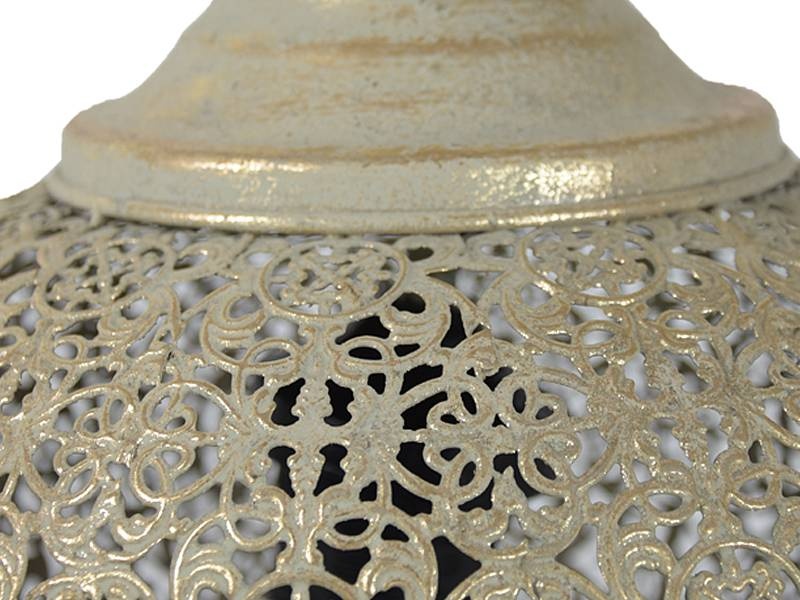 Orientalische kleine Hängelampe in warmer Atmosphäre, goldbraun gemischt, durch diese Farbe schafft sie eine Atmosphäre und Gemütlichkeit im Haus. Ein kleines Lampchen macht selbst das langweilige WC und den Flur gemütlich, damit jeder Raum im Haus nach Ihren Wünschen gestaltet ist. Die Farbe ist vintage und das bedeutet, dass sie nicht ganz gold oder braun ist, sondern eine grobe Wäsche mit hier und da etwas glänzendem Gold hat. Der orientalische Punkt unten macht es zu einer echten 1001-Nacht-Lampe aus Metall. Es gibt zierliche orientalische Muster im Metall, die funkelnd durchscheinen.