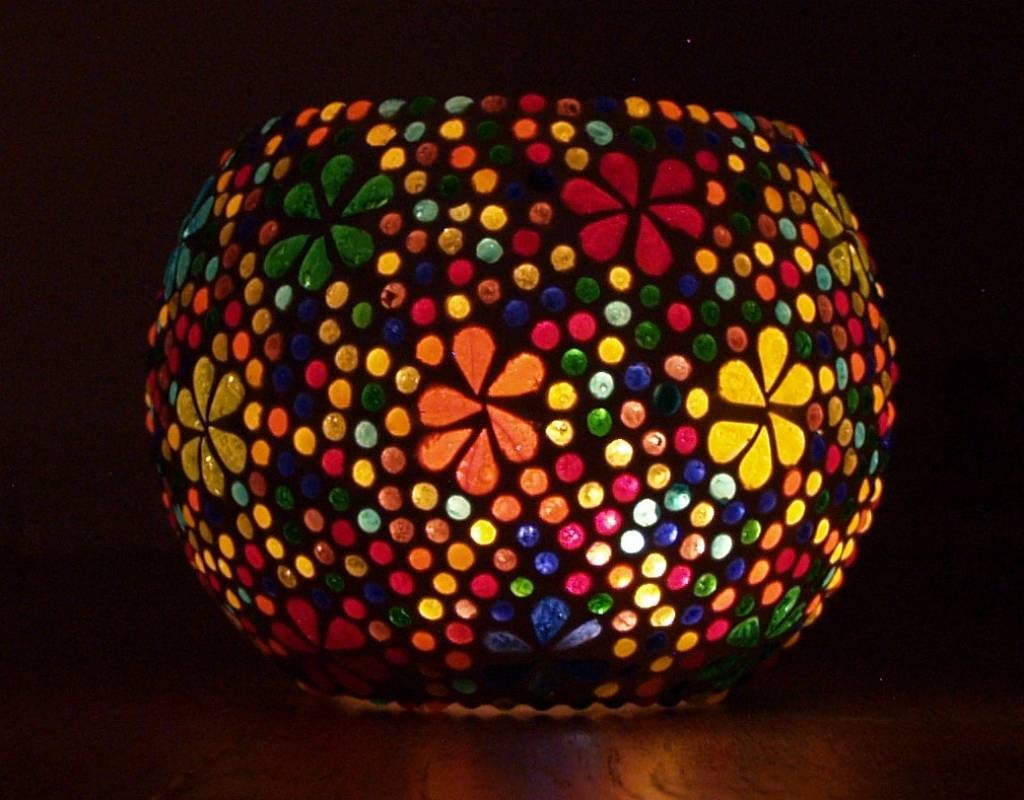 Ein extragroßer Glas-Teelichthalter mit lebendigen Mosaikstücken darauf. Zusammen wie ein Blumendesign mit runden Glasstücken herum gemacht. Abends gibt es ein sehr funkelndes Licht ab, dann lässt nur das Mosaik Licht durch und nicht den weißen Fugenmörtel.
