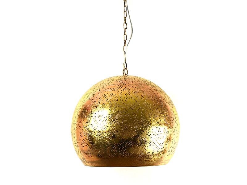 Eine wunderschöne orientalische filigrane Hängelampe in Kugelform, aus Metall gefertigt, mit kleinen runden Löchern, die ein orientalisches Muster bilden. Die Farbe an der Außenseite und Innenseite ist goldfarben, im Vintage-Stil mit einem schönen alten Look und hier und da einem glänzenden Goldton. Tagsüber strahlt diese Lampe eine sehr warme und gemütliche Atmosphäre aus und sieht schick über dem Esstisch aus. Diese Hängelampe wird oft über dem Esstisch verwendet, da die Lampe an der Unterseite offen ist und viel Licht auf die Oberfläche scheint.