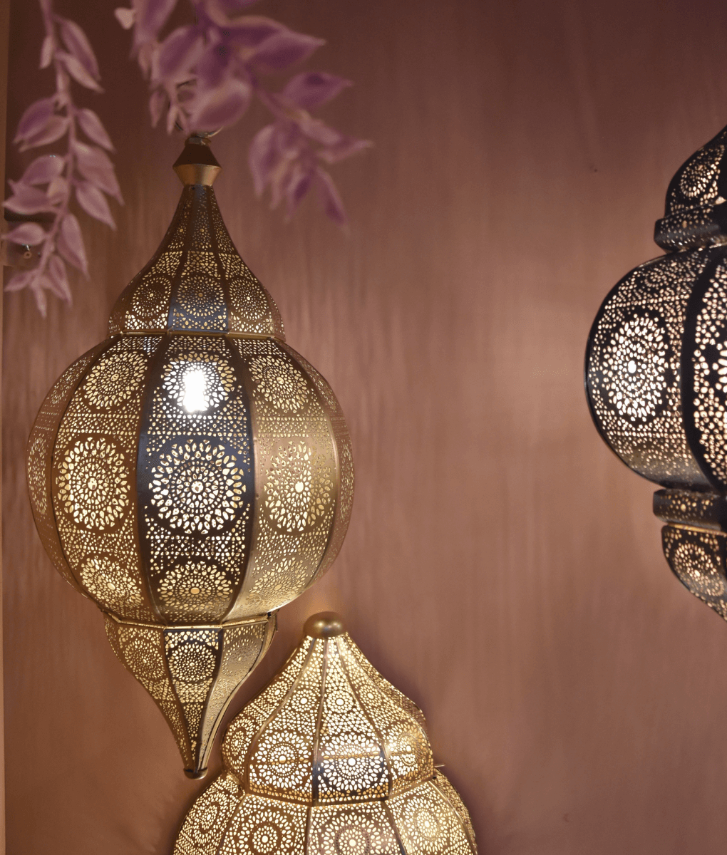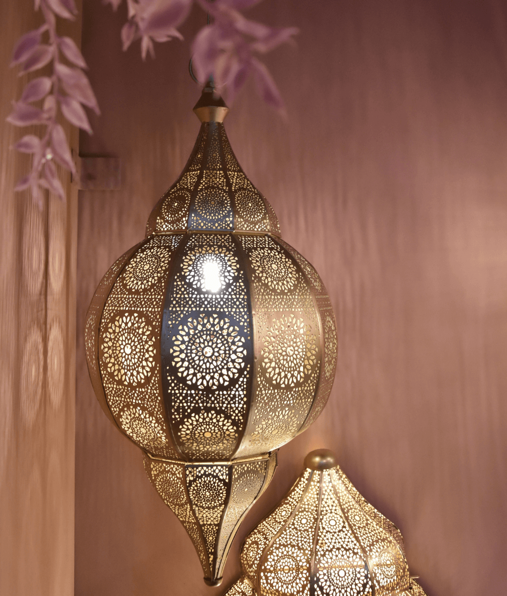 Wunderschöne Hängelampe in Goldfarbe sowohl auf der Innenseite als auch auf der Außenseite. Durch die goldene Farbe strahlt die Lampe eine warme, gemütliche Atmosphäre aus. Dieses Format eignet sich für die meisten Räume und hat unten eine schöne orientalische Spitze. An jedes Detail wurde gedacht, denn die gesamte Lampe ist mit handgefertigten, dekorativen Mustern verziert, darunter auch romantische Blumen, die durchscheinen. Die Lampe ist nicht zu schwer, sodass das Aufhängen kein Problem ist, und das Kürzen ist auch einfach, indem Sie einige Glieder entfernen."