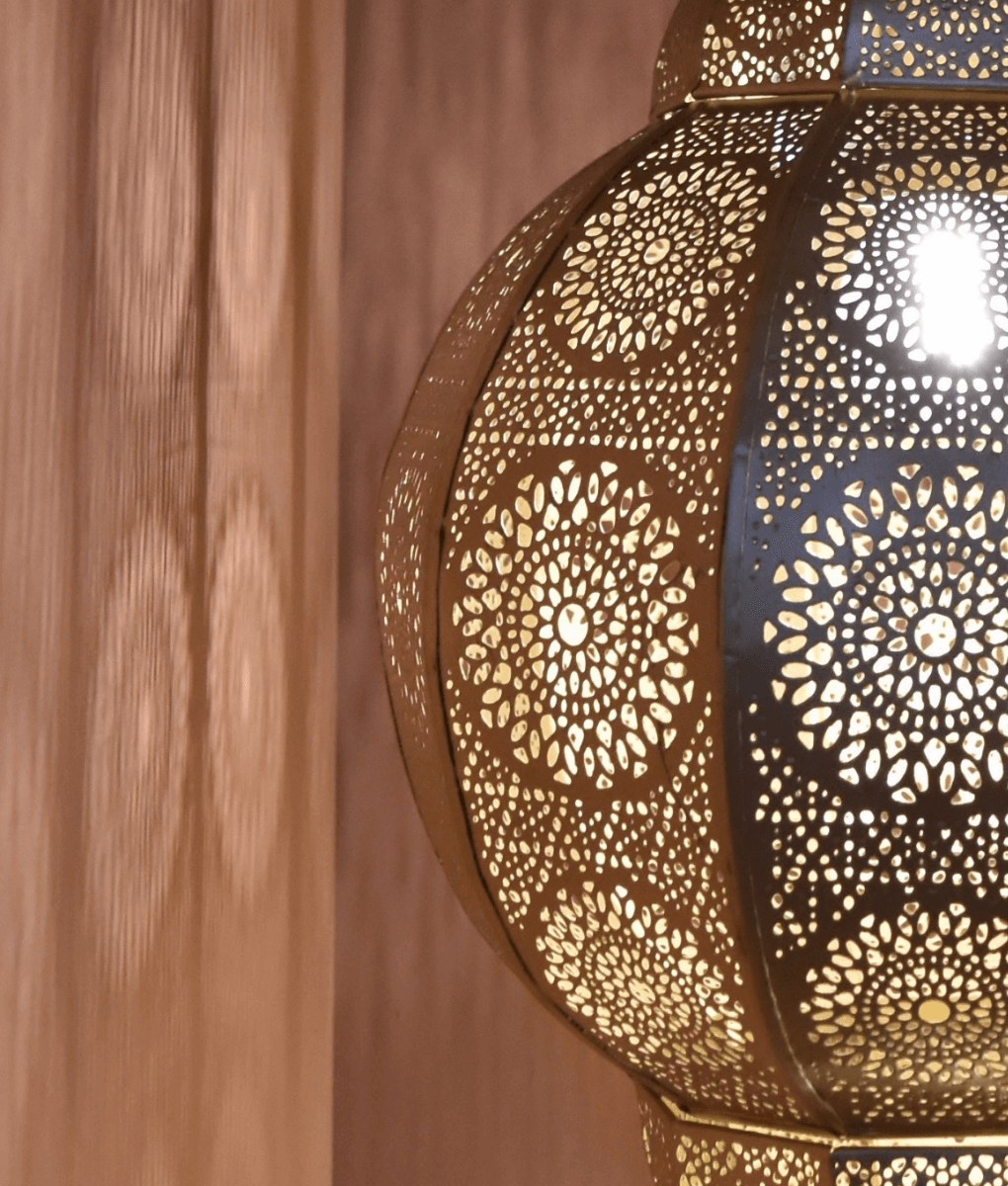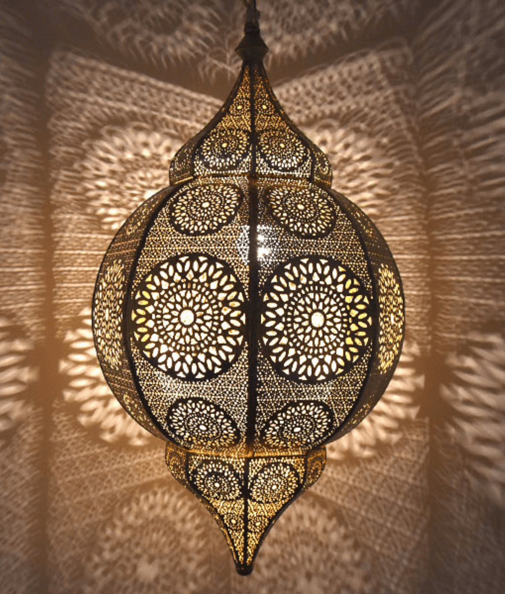 Eine goldene Hängelampe aus Metall mit filigranen Mustern, die ein schönes orientalisches Dekor an die Wand wirft. Handgefertigt in Indien.Lesen Sie mehr