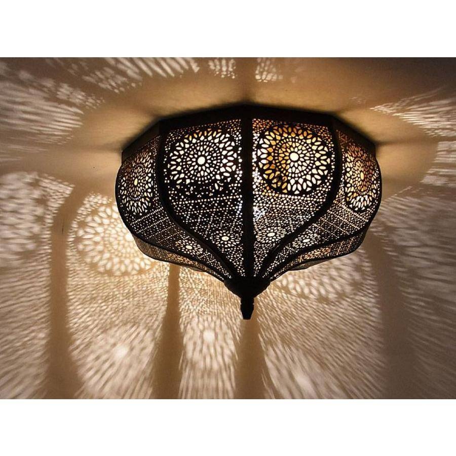 Extra große Deckenleuchte mit einem Durchmesser von beeindruckenden 42-45 cm, mit schwarzer Außenseite und warmem klarem Goldton auf der Innenseite. Die Blumenmuster sind besonders groß und sorgen für ein sehr schönes Licht, wodurch die Muster sogar noch größer an der Wand erscheinen. Es handelt sich um fein gearbeitetes Metall und echte Handarbeit von Menschen aus Indien, ein wahres Kunstwerk, wie wir finden. In der Mitte oben befindet sich eine dekorative orientalische Kappe.