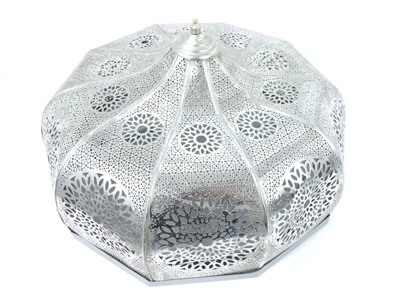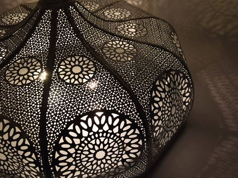 Tagsüber ist sie ein wunderschöner Anblick, aber auch abends leuchtet sie schön durch und projiziert die Muster an die Wand. Die Innenseite ist matt silbern und sorgt dadurch für helles, klares Licht. In der Mitte befindet sich ein schön verarbeitetes orientalisches Element, das genau den magischen Touch verleiht. Die Größe beträgt 42-45 cm im Durchmesser, es handelt sich um Handarbeit, daher ist jedes Stück einzigartig und kann leicht variieren. Es sind 2 große E27-Fassungen enthalten, und Sie können mit dem Licht spielen, um es so hell oder warm zu gestalten, wie Sie möchten.