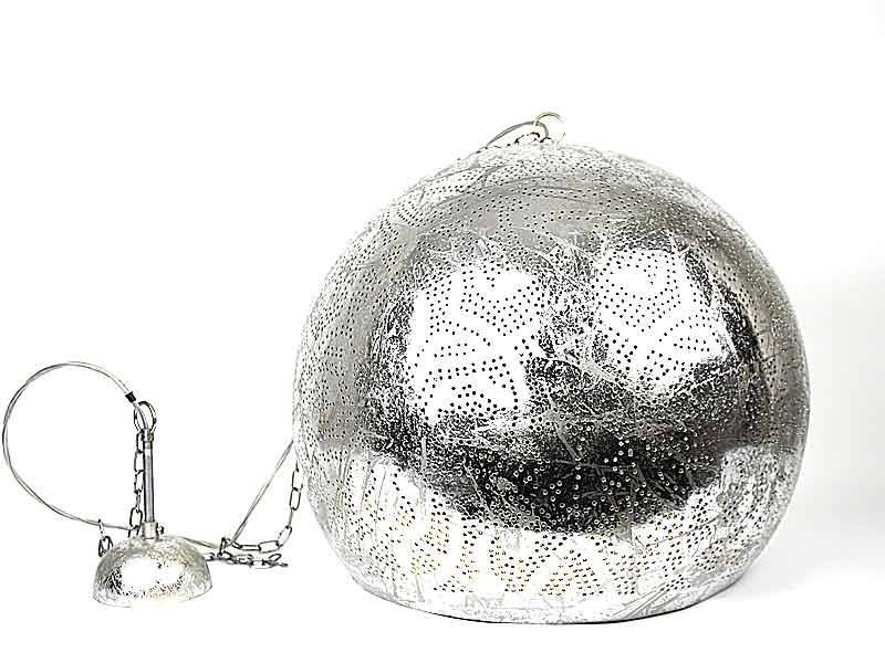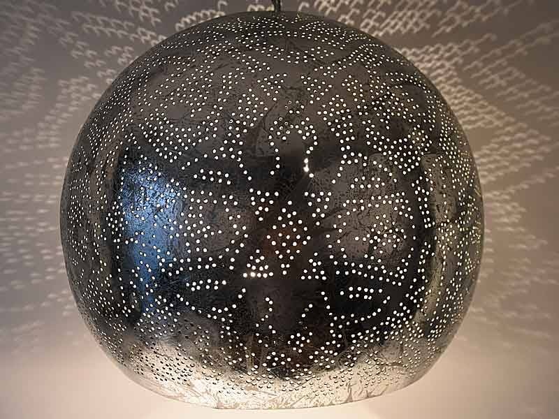 Große filigrane Hängelampe in Silber mit einer sehr großen kugelförmigen Größe, ideal als Esstischbeleuchtung. Die Unterseite ist komplett offen und strahlt daher auf eine große Fläche aus. In der Kugel befinden sich viele gestanzte Löcher, die zusammen ein orientalisches Muster bilden, wenn die Lampe am Abend eingeschaltet ist. Tagsüber ist die Lampe aufgrund ihrer Größe und der Vintage-Farbe Silber bereits spektakulär.