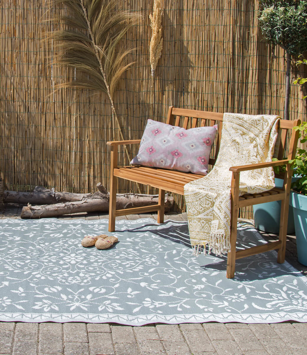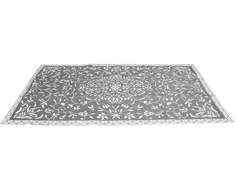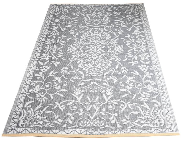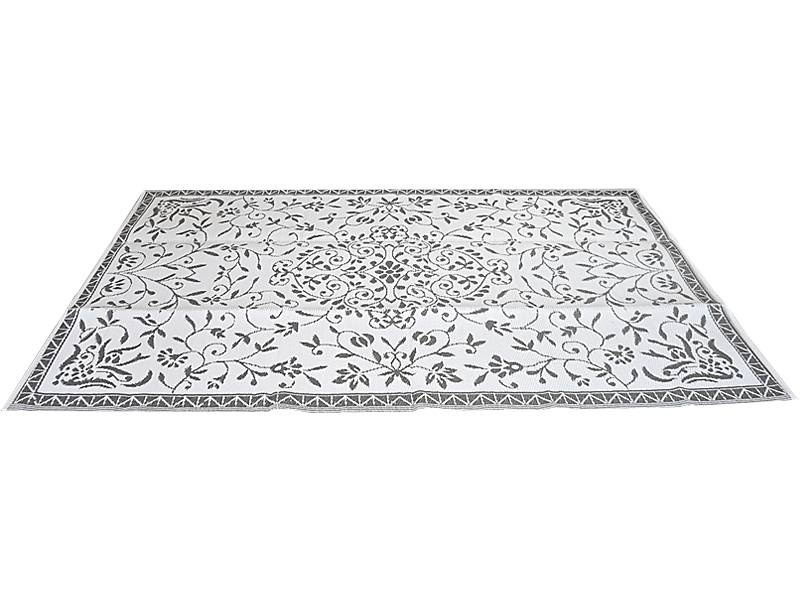 Ein eleganter Außenteppich in den Farben Grau und Weiß mit wunderschönen orientalischen Prints. Diese Teppiche werden in Indien in einem Stück produziert, sodass keine Falten entstehen und sie glatt auf dem Boden liegen, sodass das Muster schön durchläuft. Sie sind leicht aufzurollen und leicht, also nehmen Sie sie ruhig mit auf den Campingplatz oder an den Strand. Ideal und es sieht super gemütlich aus.