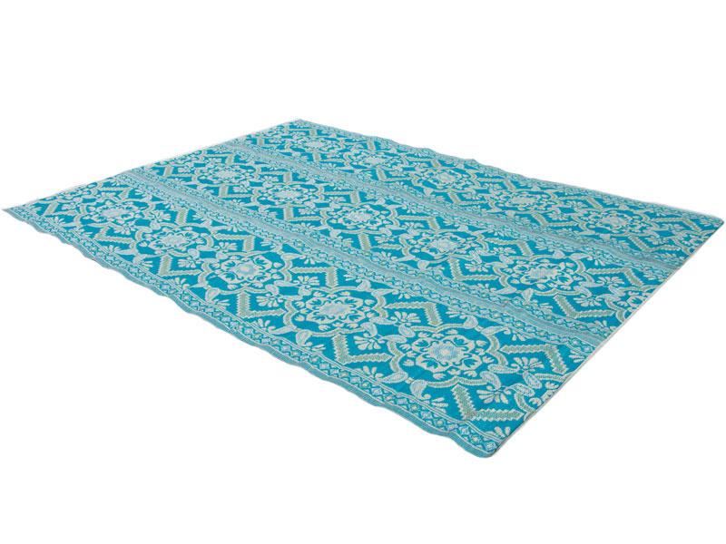 ehr großes Kunststoff-Gartenteppich in den Farben Türkis, Beige und Gold mit einem wunderschönen orientalischen Design. Der Teppich besteht aus 3 Bahnen, die miteinander vernäht sind und sich dadurch leicht zu einem kleinen Paket zusammenfalten lassen. Das macht den Transport mit dem Auto zum Campingplatz einfach.